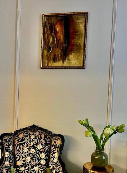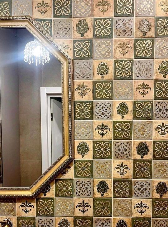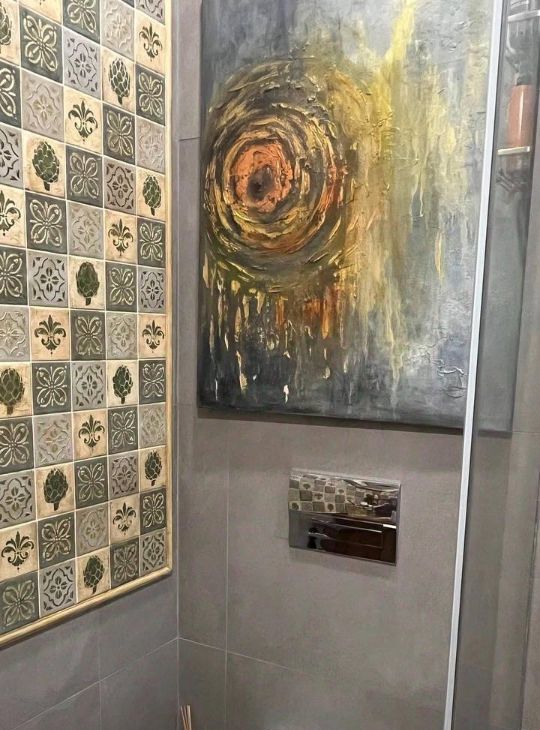 Интерьер: картины, кресла, красивая плитка в санузле.