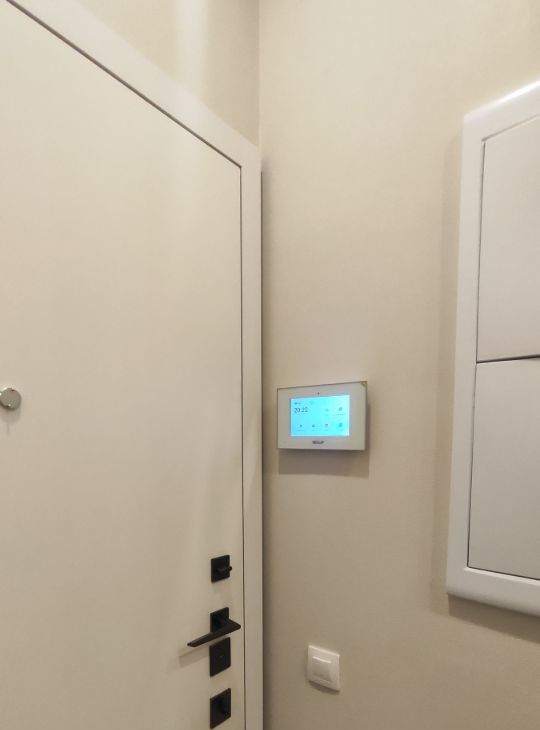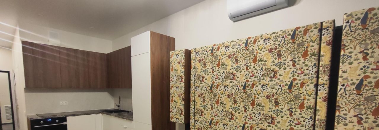 Встроенный кухонный гарнитур со всей необходимой техникой ( холодильник, варочная панель, вытяжка, духовой шкаф с функцией свч, посудомоечная и стиральная машины). Имеется много места для хранения, зона прихожей. Установлен кондиционер. Обеденный стол, смарт-телевизор.