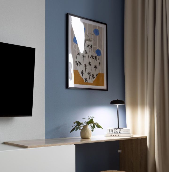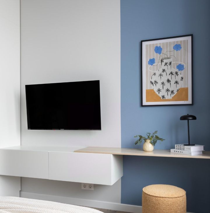 И мебелью: кровать с системой хранения внутри и качественным ортопедическим матрасом Ascona, рабочий стол, комод, вместительные шкафы, голошница.