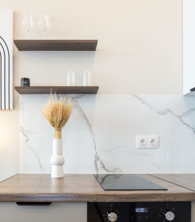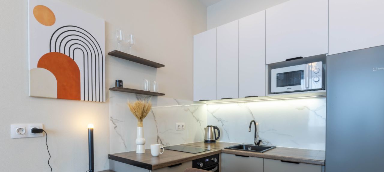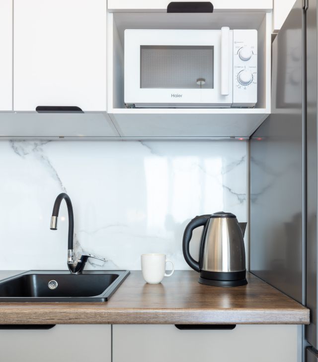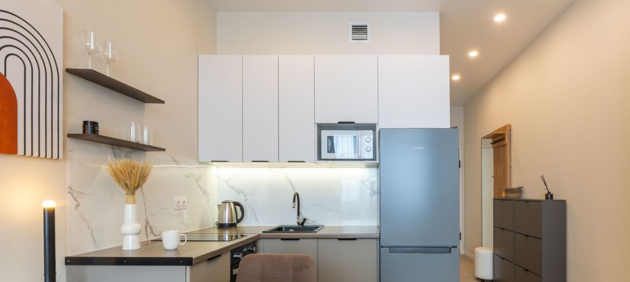 Кухня укомплектована посудомоечной машиной, микроволновкой и духовым шкафом.