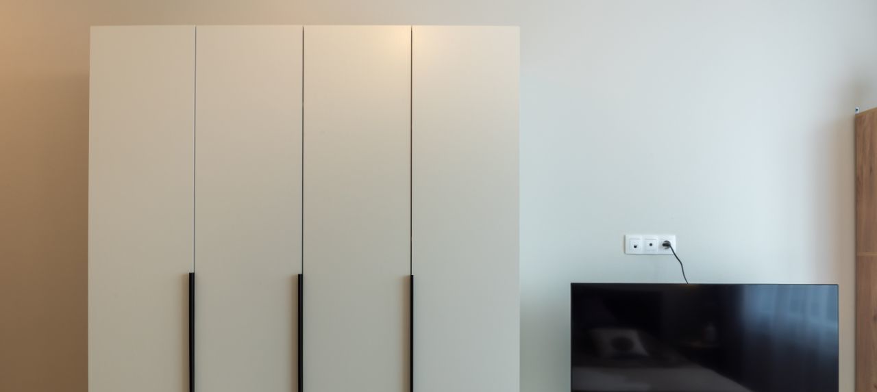 Есть шкаф, двуспальная кровать, комод, стеллаж. Много продуманных мест для дополнительного хранения.