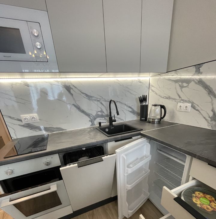 • Кухня по индивидуальному проекту со встроенной техникой: плита, духовка, посудомойка, микроволновка, холодильник, стиральная машина;