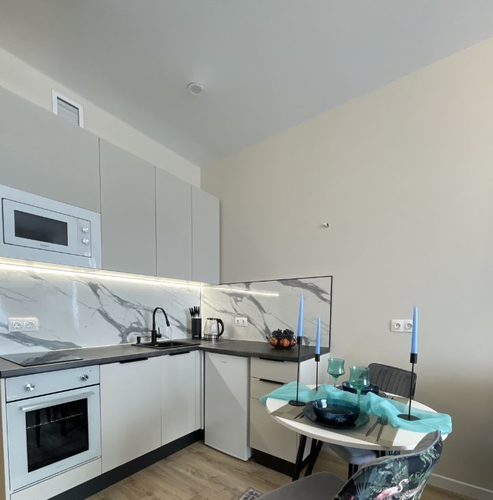 • Предусмотрено всё необходимое для жизни: посуда для еды и готовки, постельный текстиль, полотенца, фен, отпариватель — заезжай и живи!
