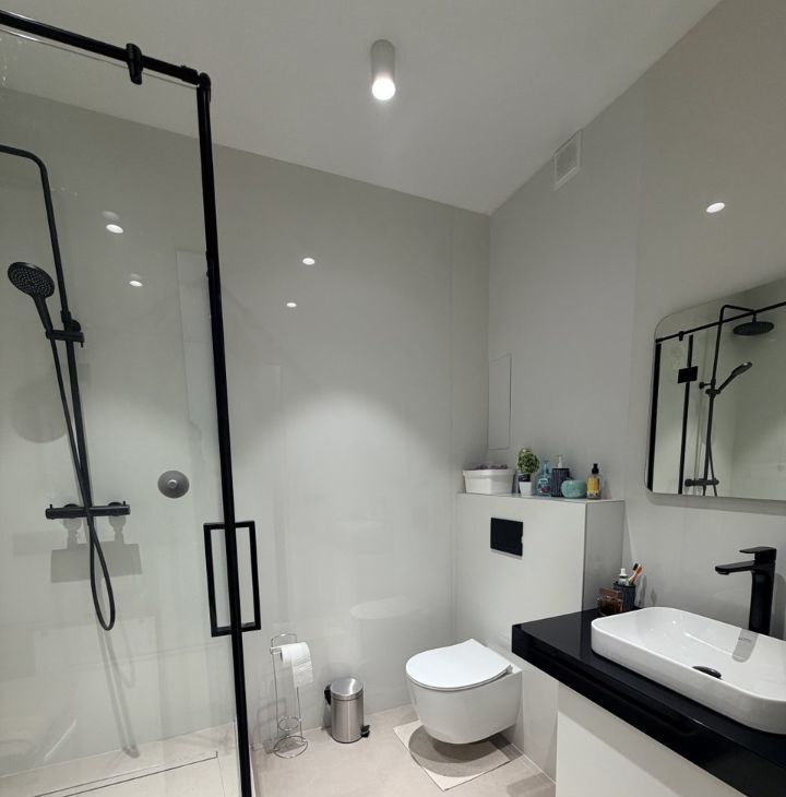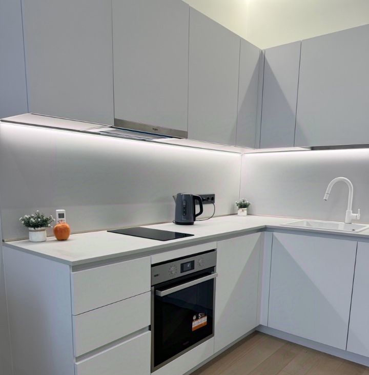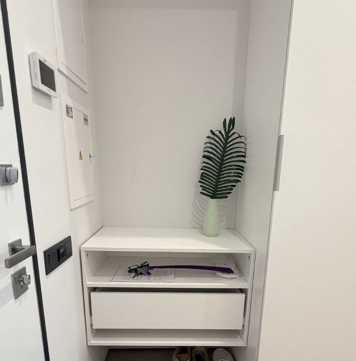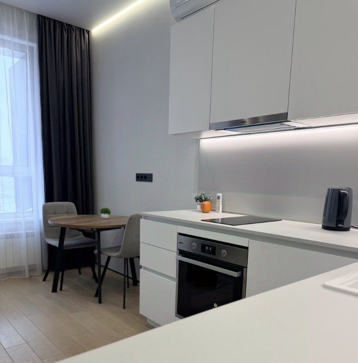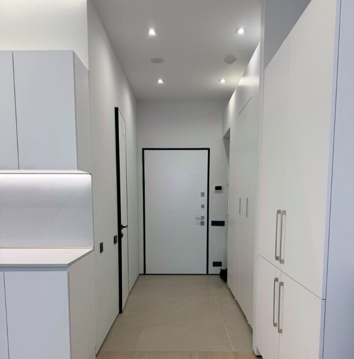 В квартире выполнен ДИЗАЙНЕРСКИЙ ремонт с лаконичном стиле, двери invisible, в интерьере превалируют белые и серые оттенки.