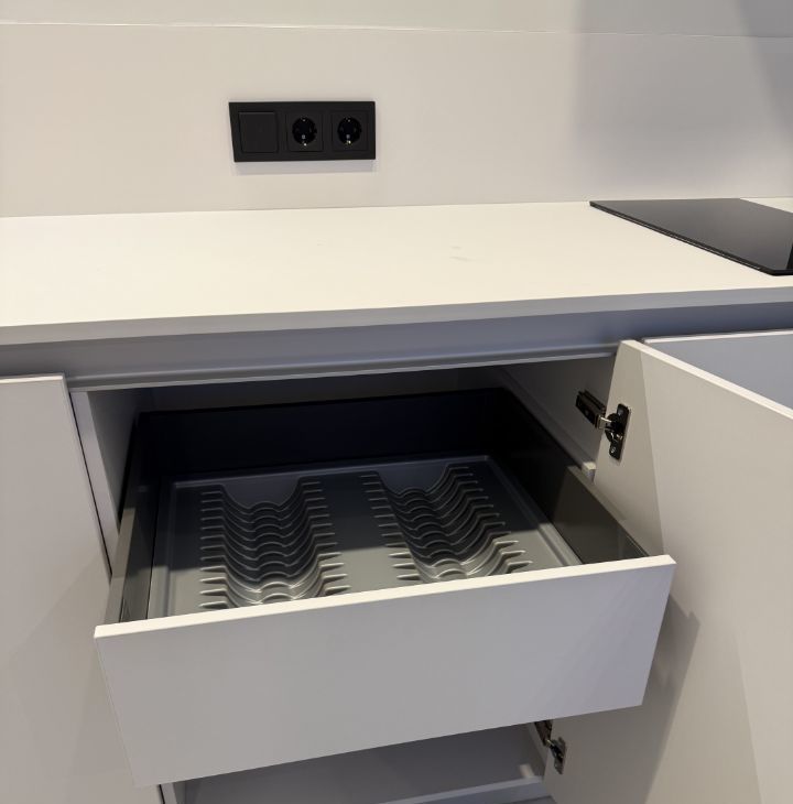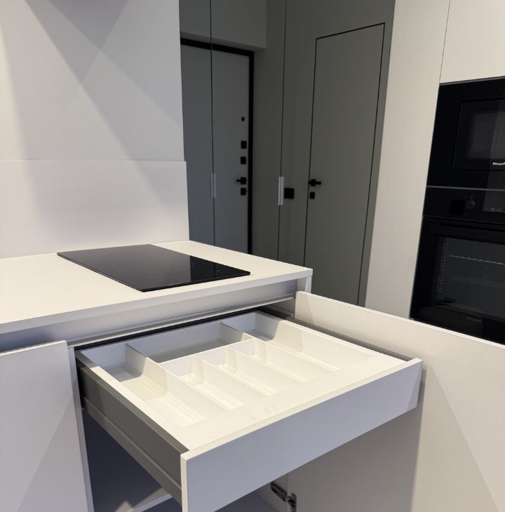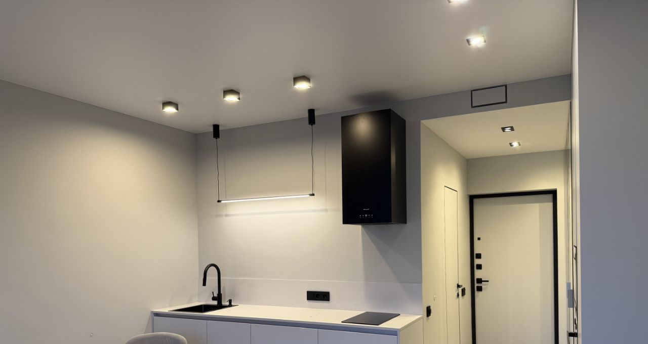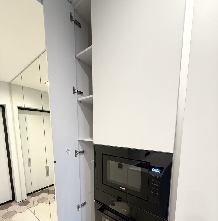 В кухонной зоне установлен качественный гарнитур со встроенным холодильником, духовкой, посудомойкой, микроволновкой и дополнительным освещением рабочей зоны и обеденного стола.