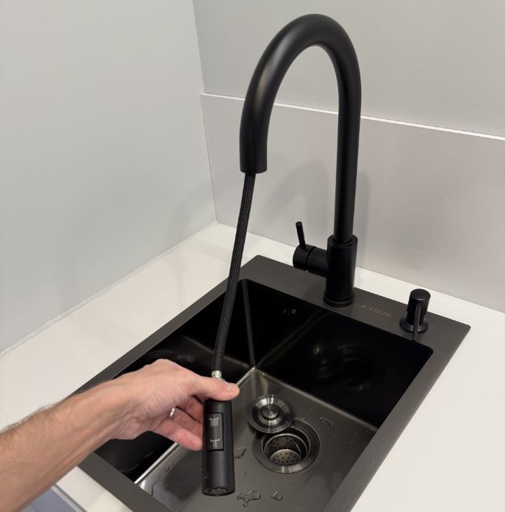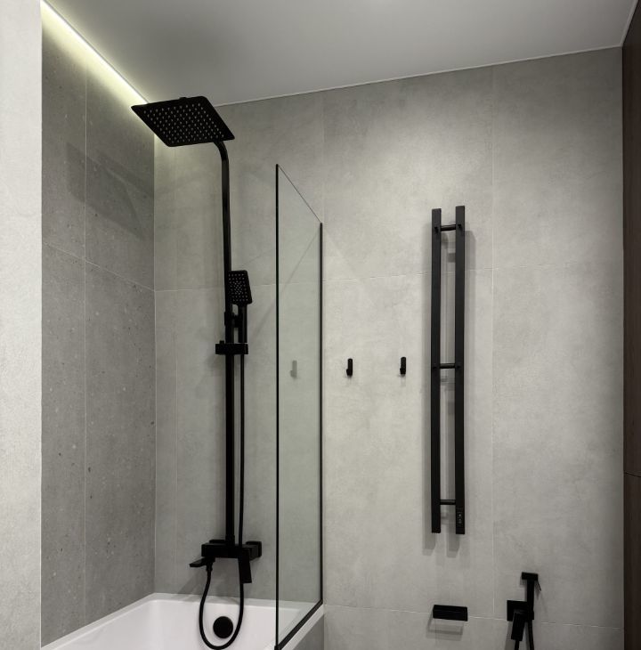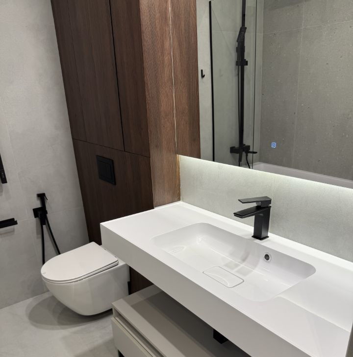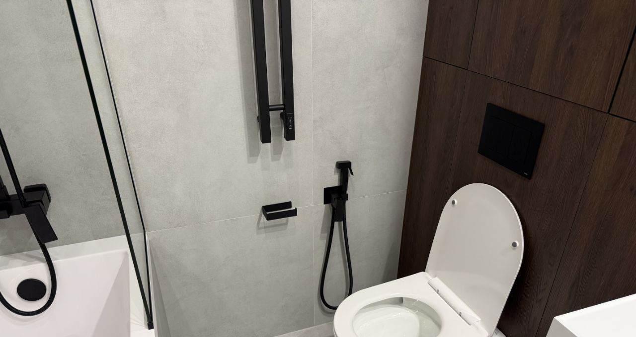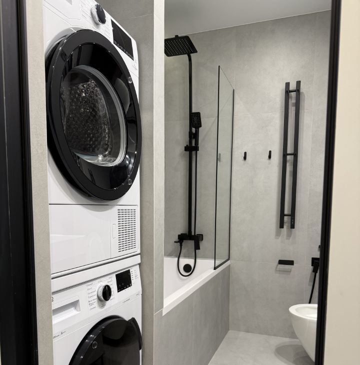 В ванной комнате: роскошная ванна, включая бразильский душ и настройки направления воды на лейке, широкая раковина (120 см) и большое зеркало, стиральная и сушильная машины. Имеются проточный водонагреватель на случай отключения горячей воды и датчики протечки.