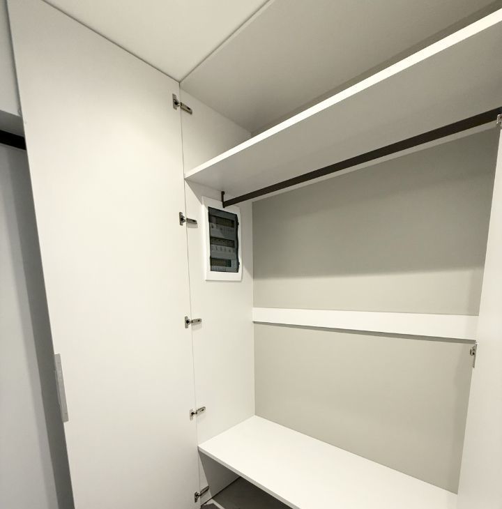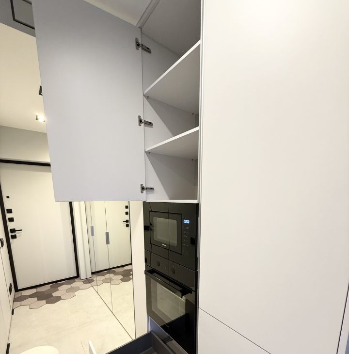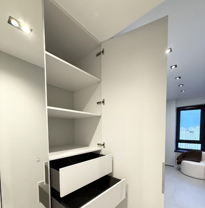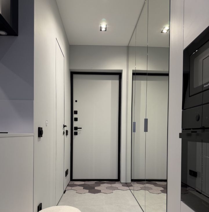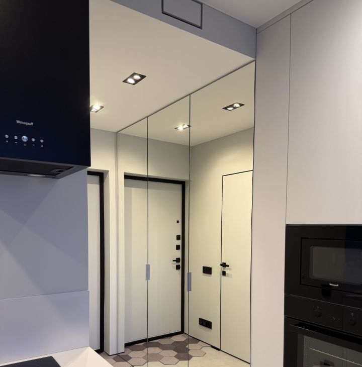 В прихожей имеется вместительный шкаф с выкатными ящиками и зеркалами от пола до потолка с ярким освещением.
