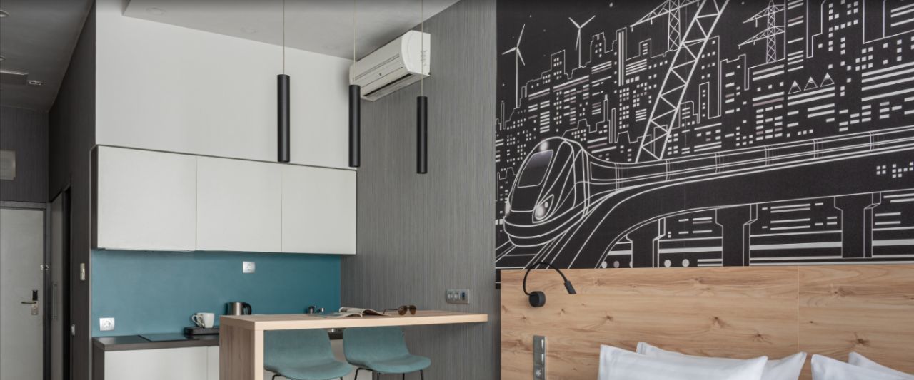 Студия с большой двуспальной кроватью и мини-кухней площадью 24 кв.м располагает всем необходимым для комфортного проживания для 1 или 2 человек.