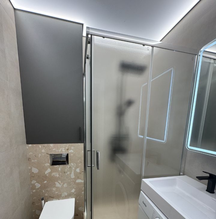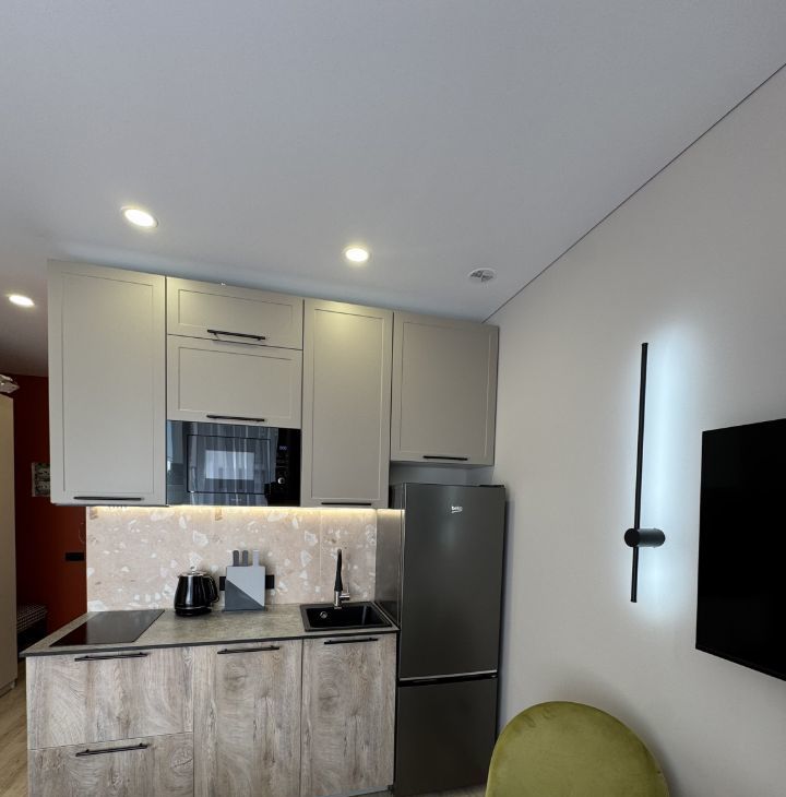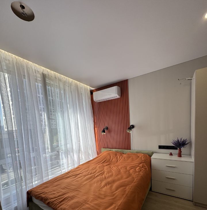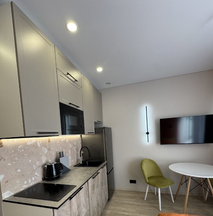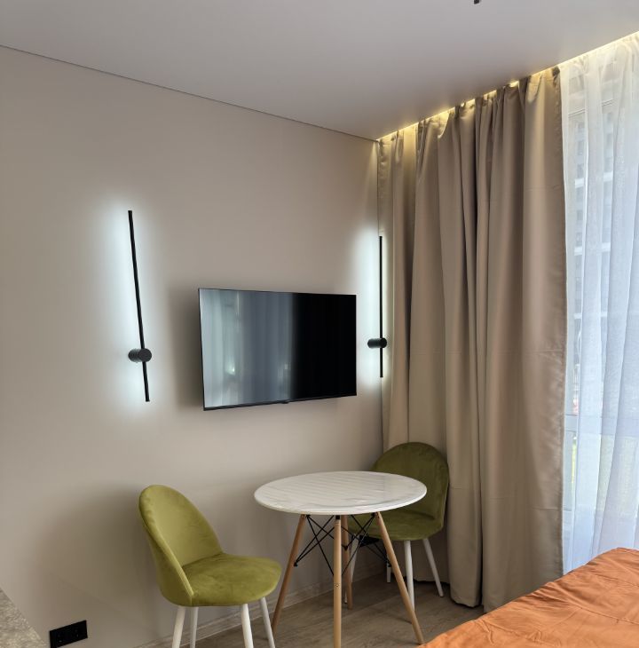В квартире сделан дизайнерский ремонт, который создаст атмосферу уюта и современности. В комнате и на кухне есть вся необходимая мебель, что делает проживание комфортным и беззаботным. В распоряжении арендатора современная техника: кондиционер, холодильник, телевизор, посудомоечная и стиральная машины. Ванная комната оснащена душевой кабиной.