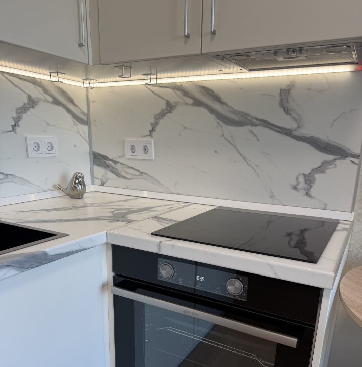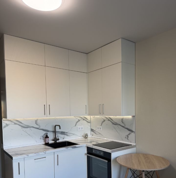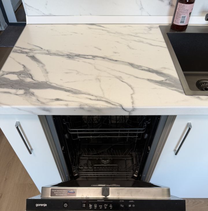 Кухня для студии довольно большая и оборудована лучшей техникой: индукционная плита на 3 конфорки, полноценная духовка, посудомоечная машина, кран с фильтрованной питьевой водой.