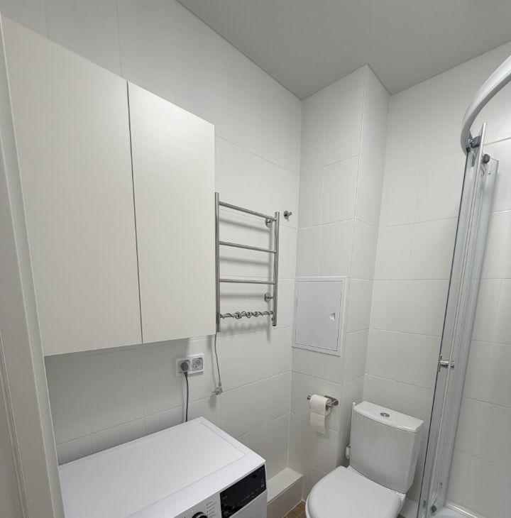 В ванной комнате душевая кабина, 3 шкафчика для хранения и большая стиральная машина.
