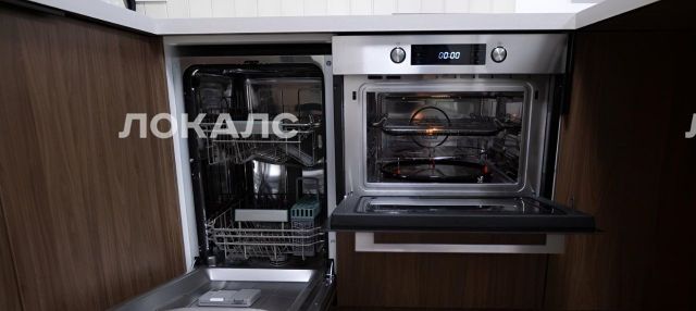- встроенный кухонный гарнитур, посудомойка, духовой шкаф+СВЧ, холодильник, электрическая плита, вытяжка, кондиционер, чайник, барный стул, посуда