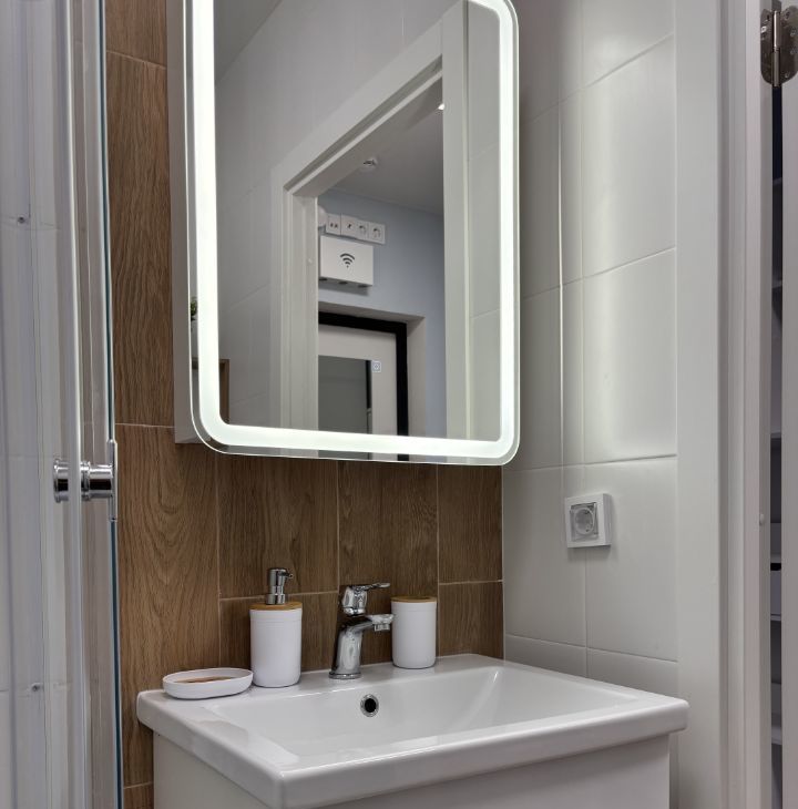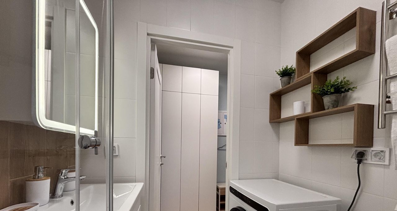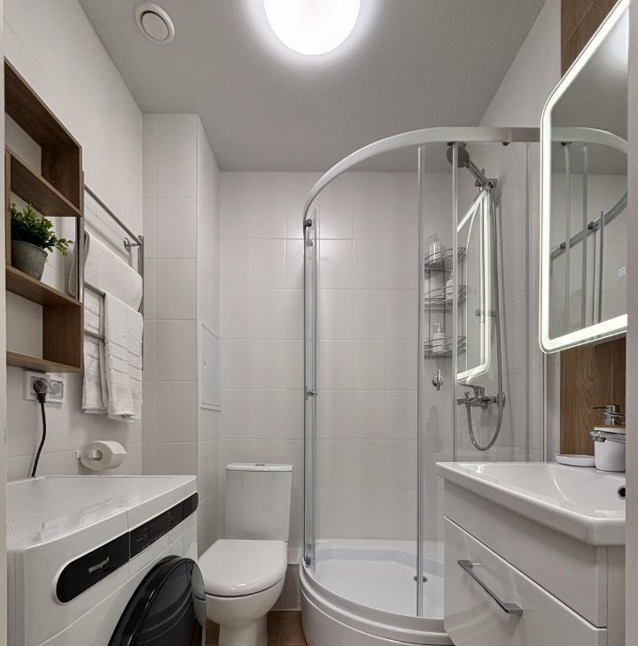 В ванной комнате установлена душевая кабина, что создаёт дополнительный комфорт. Новая Стиральная машина автомат с сушкой для ухода за вашими вещами .