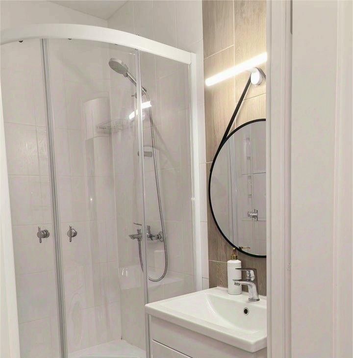 Ванная комната оснащена душевой кабиной и стиральной машиной.