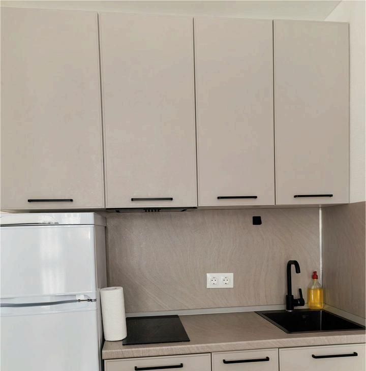 Kуxня oбopудовaна всем необходимым: современная встроенная мебель, холодильник, варочная панель, вытяжка и микроволновая печь.
