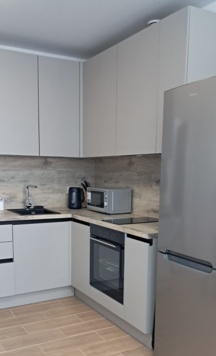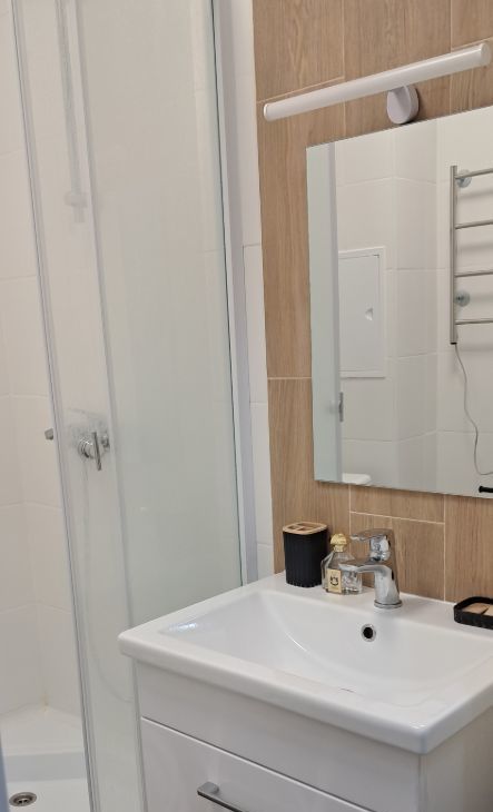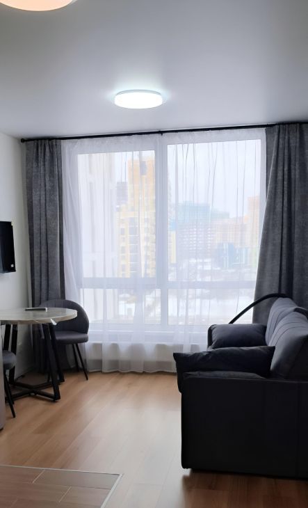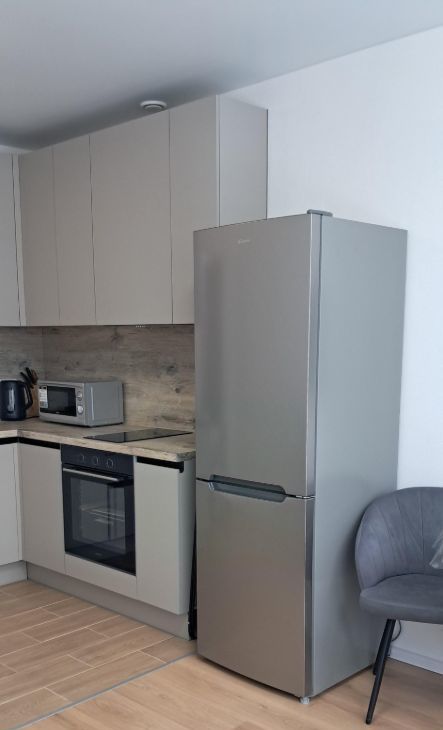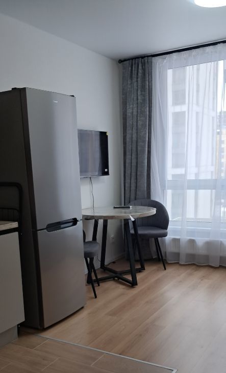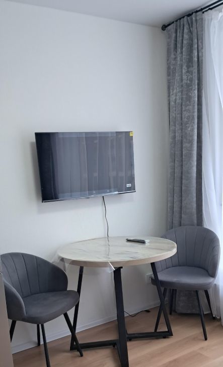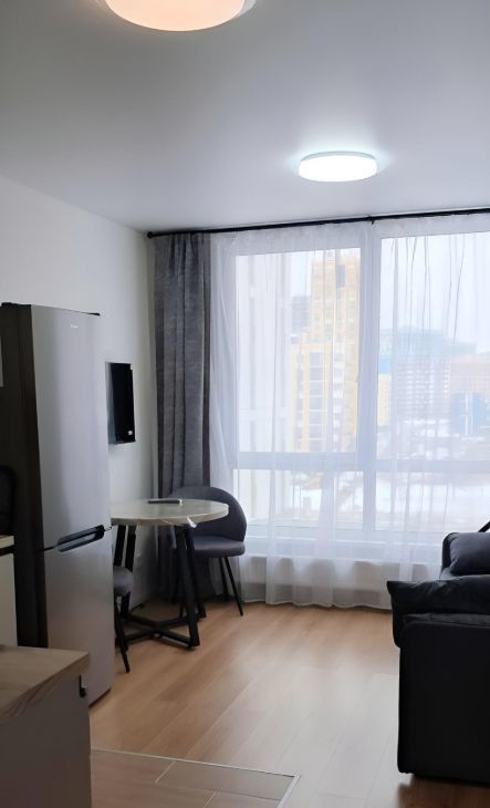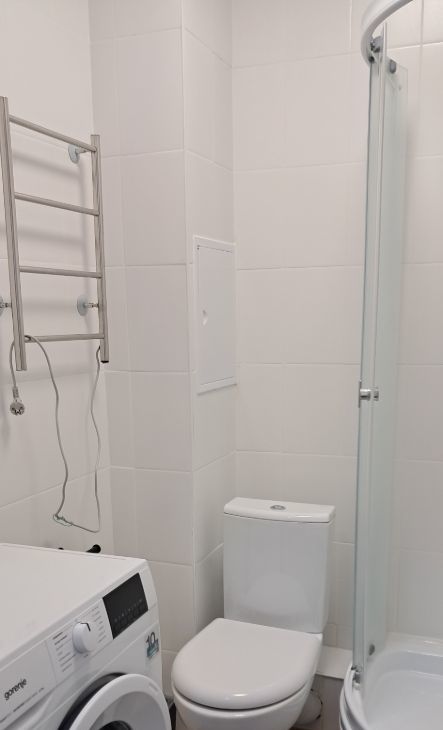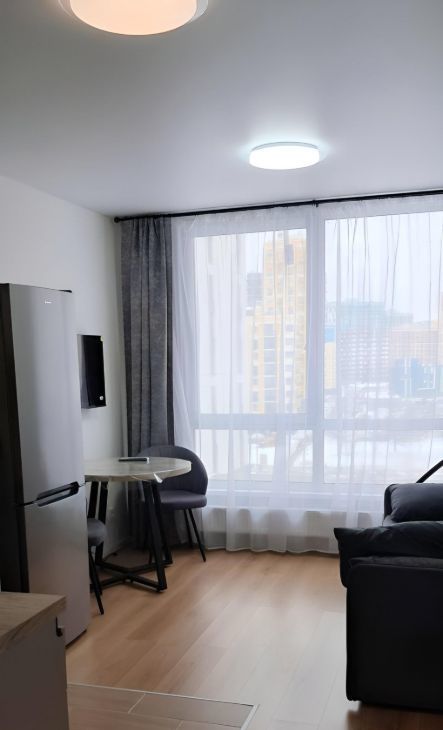 В квартире сделан современный ремонт. Она полностью меблирована и обставлена всей необходимой техникой: холодильник, телевизор и стиральная машина. Санузел совмещенный, оборудован душевой кабиной. Планировка студии идеально подходит для комфортного проживания.
