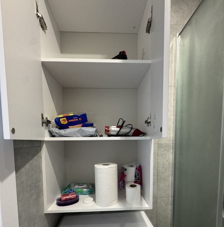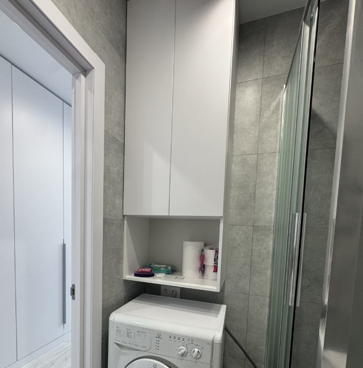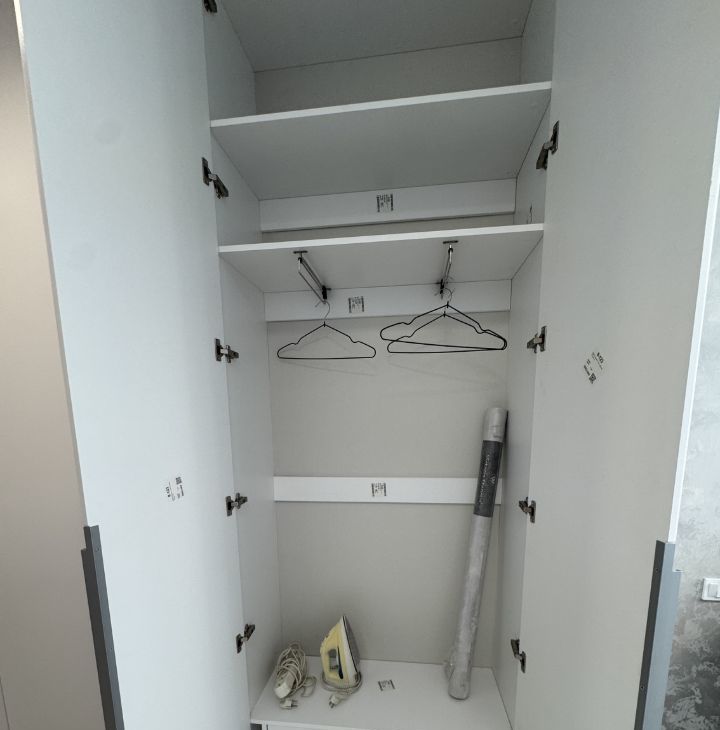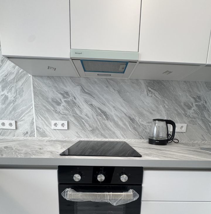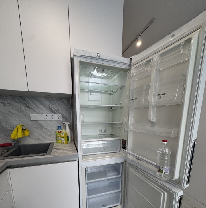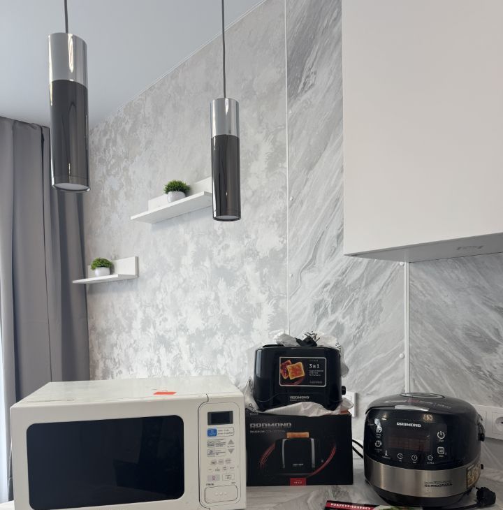 Техника: холодильник, индукционная плита, духовка, стиральная машина, а также микроволновая печь, ТОСТЕР, МУЛЬТИВАРКА, утюг и фен, чайник.