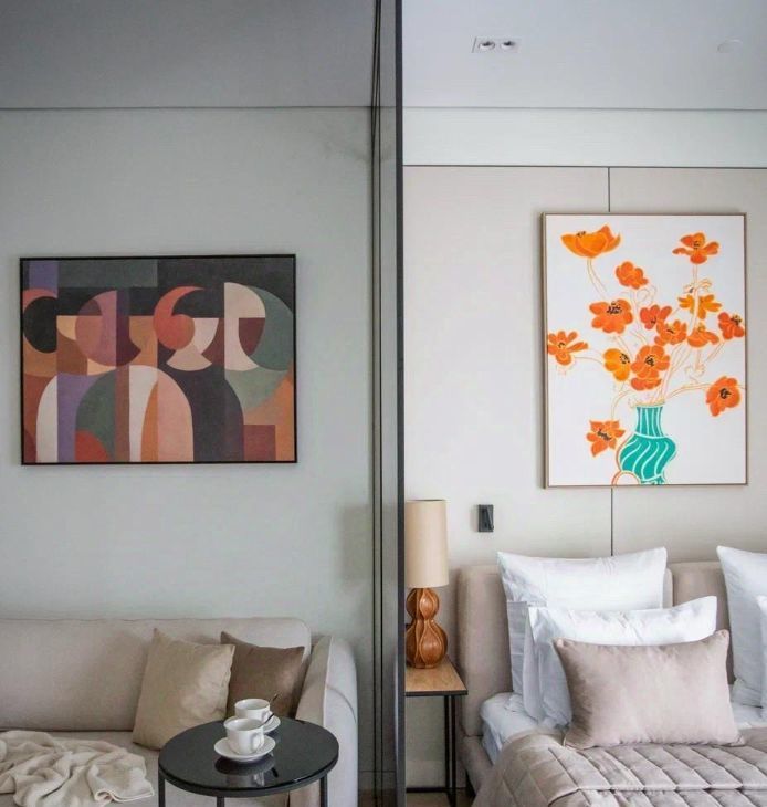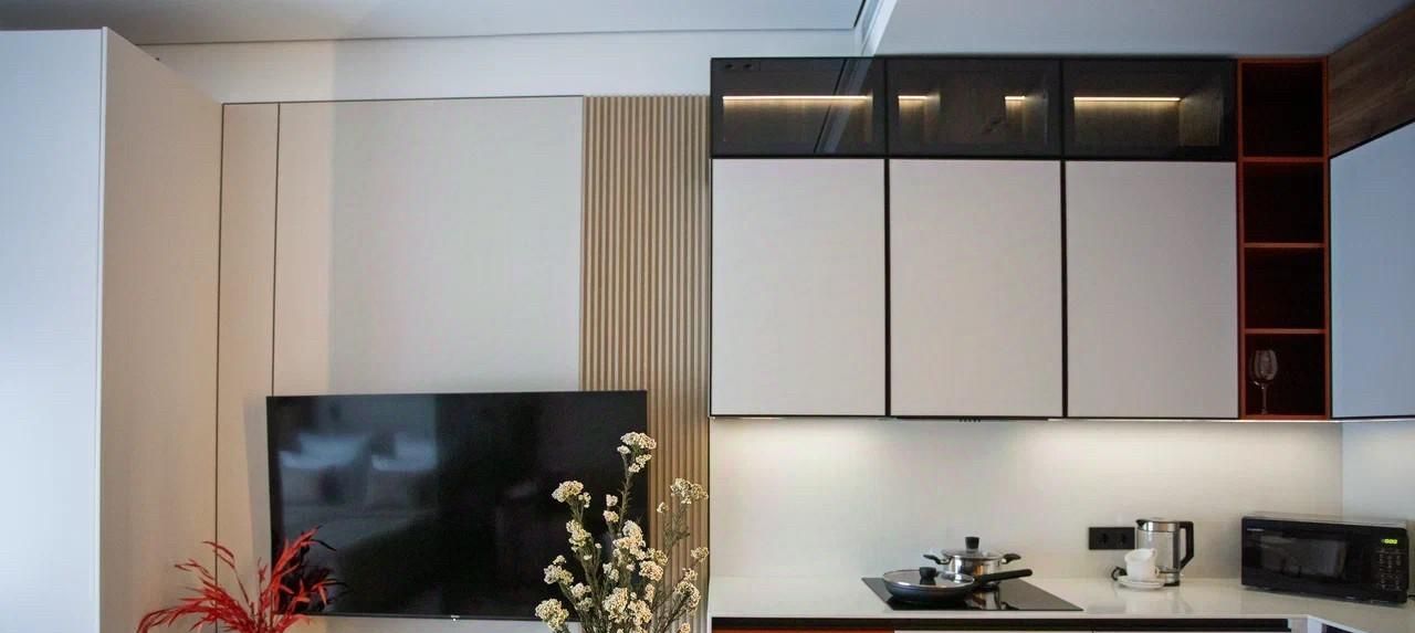 - гостиная зона оснащена дизайнерским раскладным диваном, тв-тумбой телевизором и кресло.