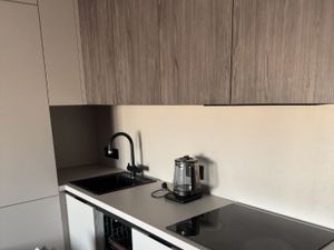 - Кухонная зона с варочной панелью, микроволновкой и холодильником
