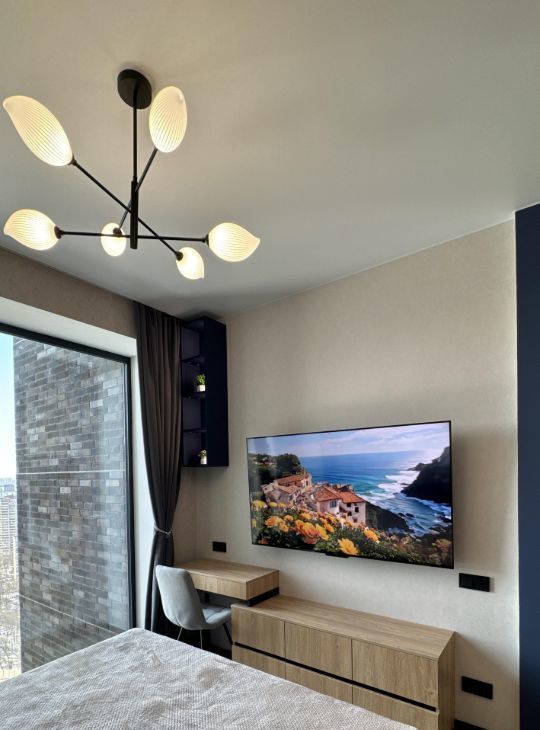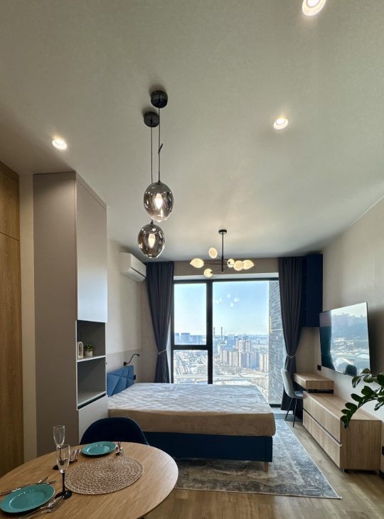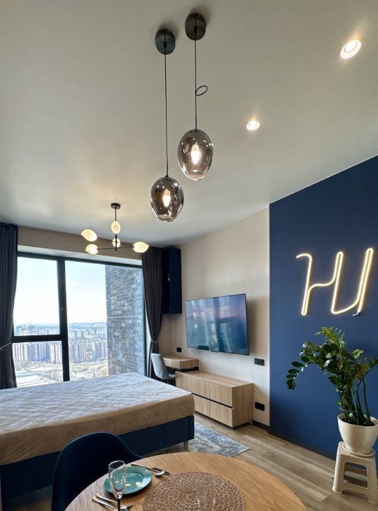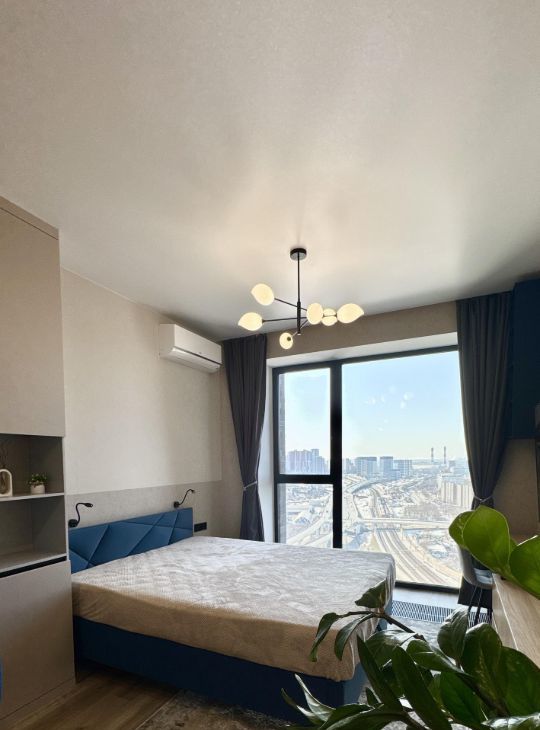 Высокие 3-метровые потолки создают ощущение простора, а панорамное окно с видом на город наполняет пространство светом и энергией города.
