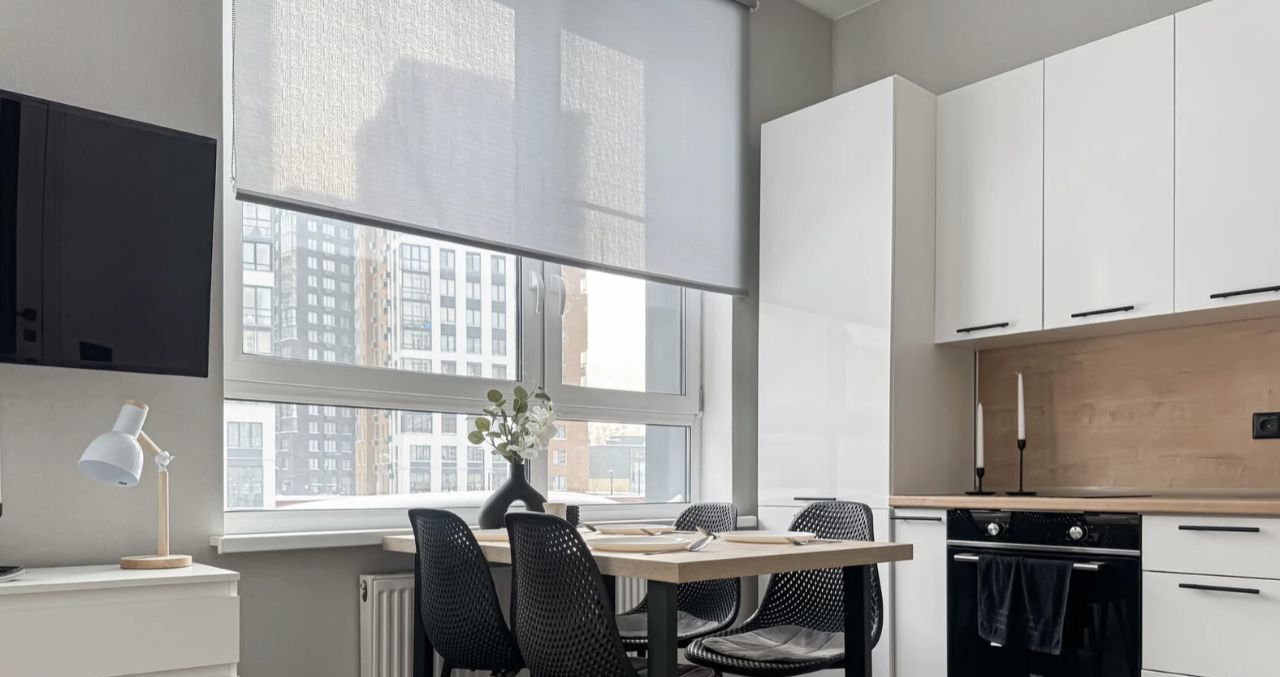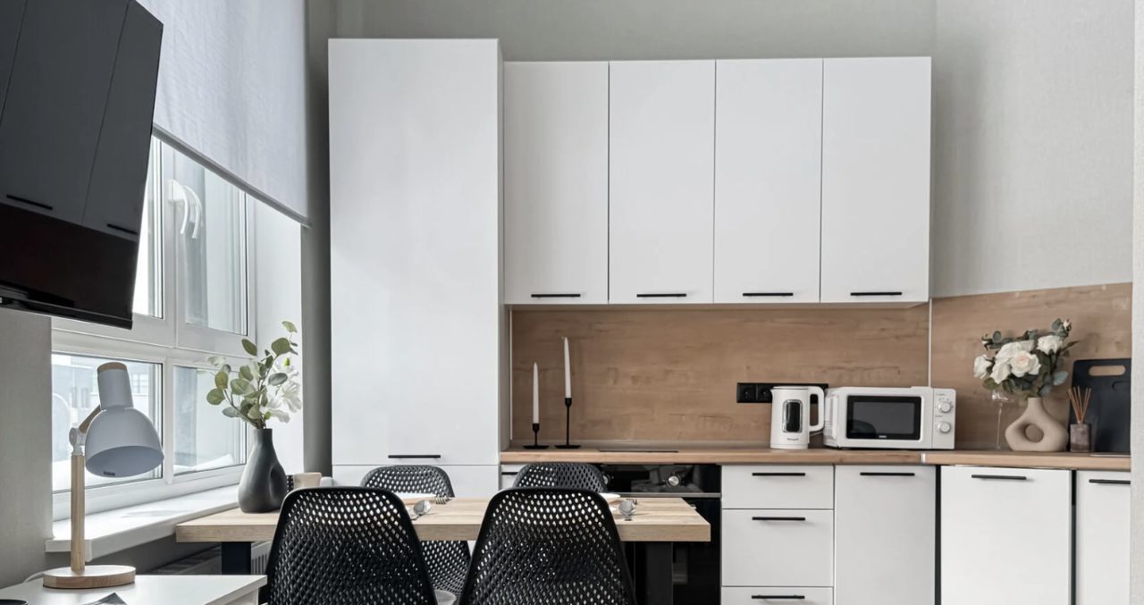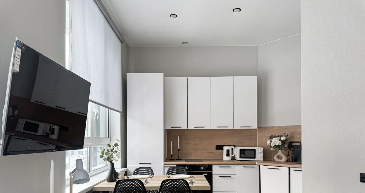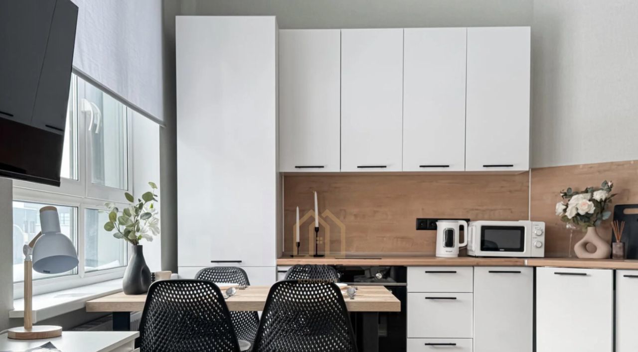 Студия выполнена в лаконичном минималистичном стиле: много света, мягкая цветовая палитра и удобная планировка создают ощущение простора и уюта. Пространство продумано для комфортной жизни и хранения вещей. Здесь есть зона отдыха с раскладным диваном и телевизором, зеркало в полный рост, вместительные шкафы и два комода. Светлая кухня дополнена обеденным столом, а ванная комната с тропическим душем превращает ежедневные ритуалы в небольшие спа-моменты.