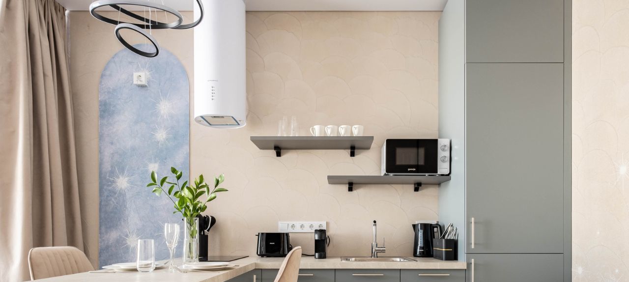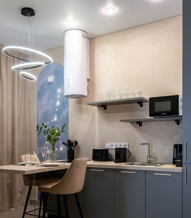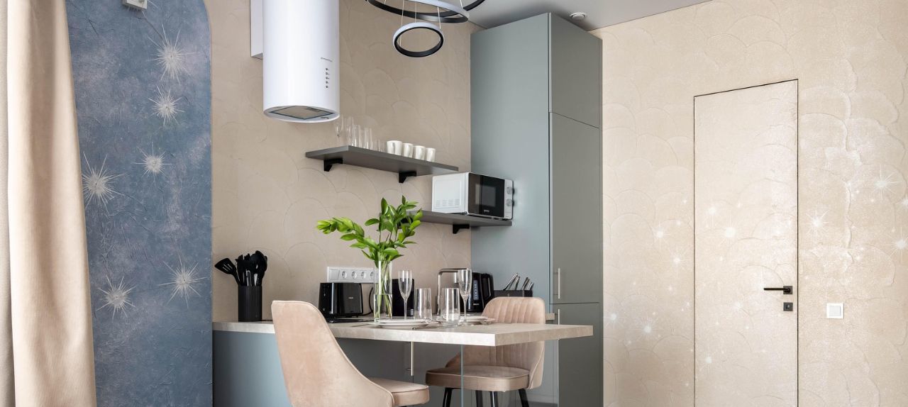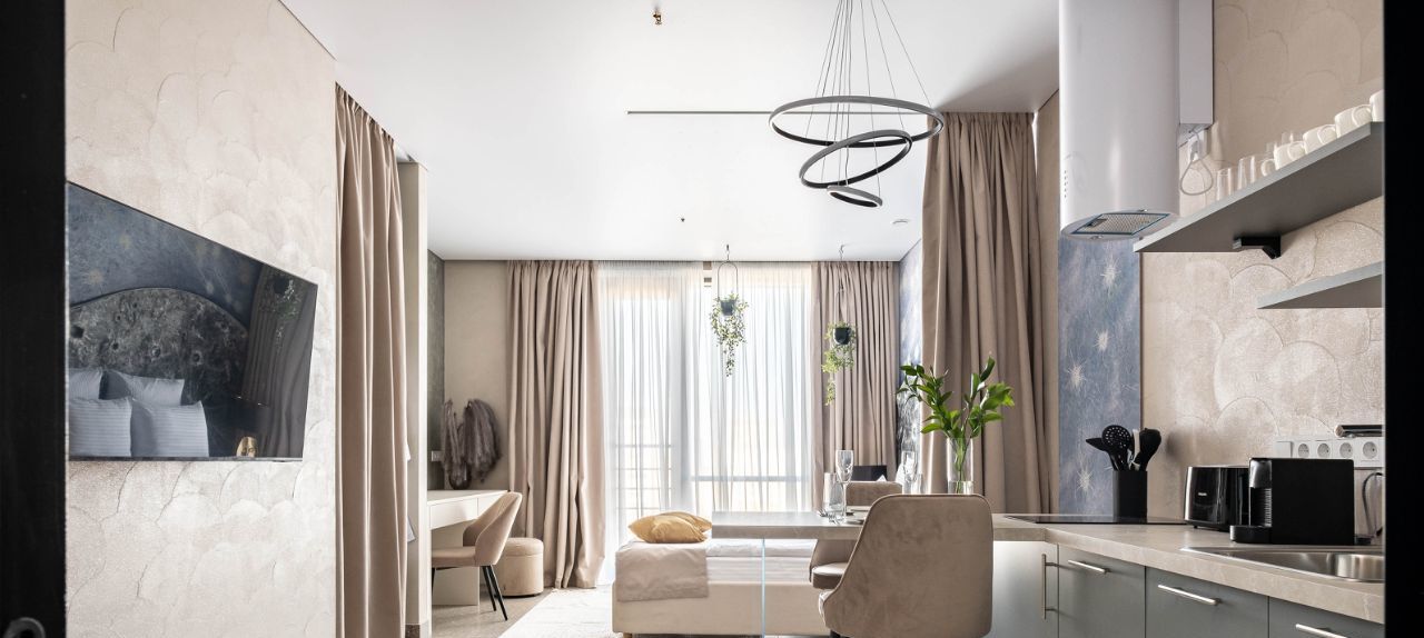 • Гостиная: Зона гостиной объединена с кухней, установлен телевизор с функцией Smart-TV.
