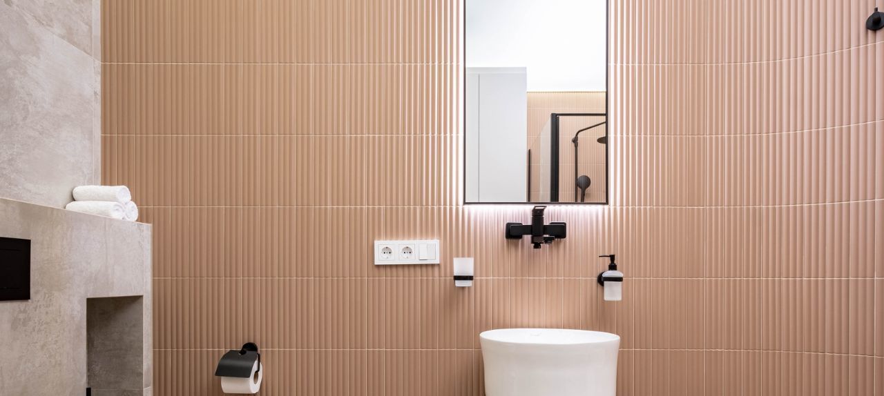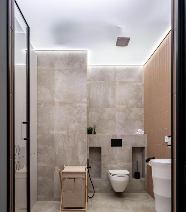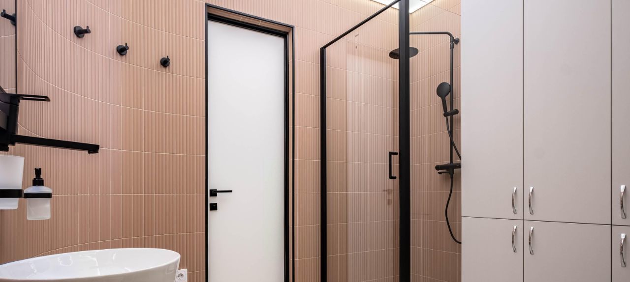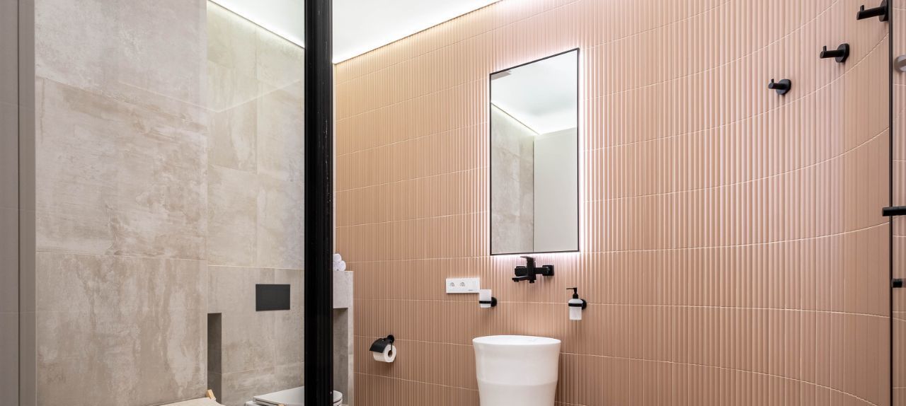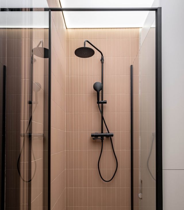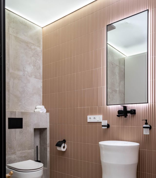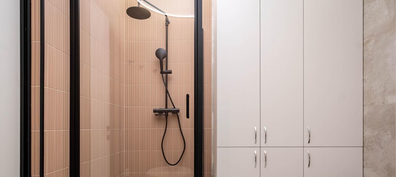 • Санузел: Современный санузел с душевой системой, раковиной и гигиеническим душем. Большой встроенный шкаф.