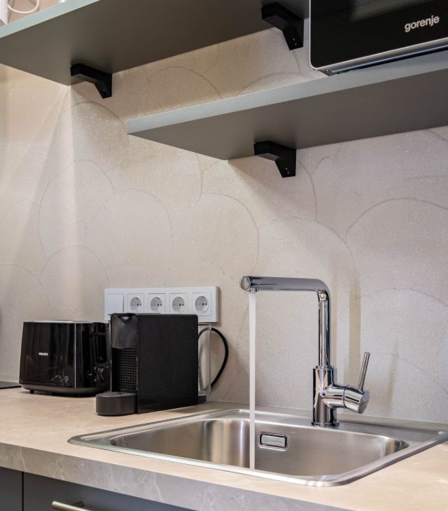 • Кухня: Полностью укомплектованная кухня с посудомоечной машиной, варочной панелью, микроволновой печью, холодильником, кофемашиной, тостером и чайником. Также предусмотрены предметы декора и посуда для приготовления и сервировки блюд.