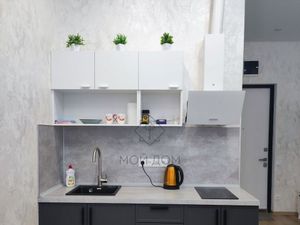 В студии продумана каждая деталь: удобная мебель на кухне и в комнате, а также вся необходимая техника. Есть кондиционер, холодильник, посудомоечная и стиральная машины, телевизор. Ванная комната оснащена душевой кабиной. Планировка студии идеально подходит для комфортного проживания одного человека или пары.