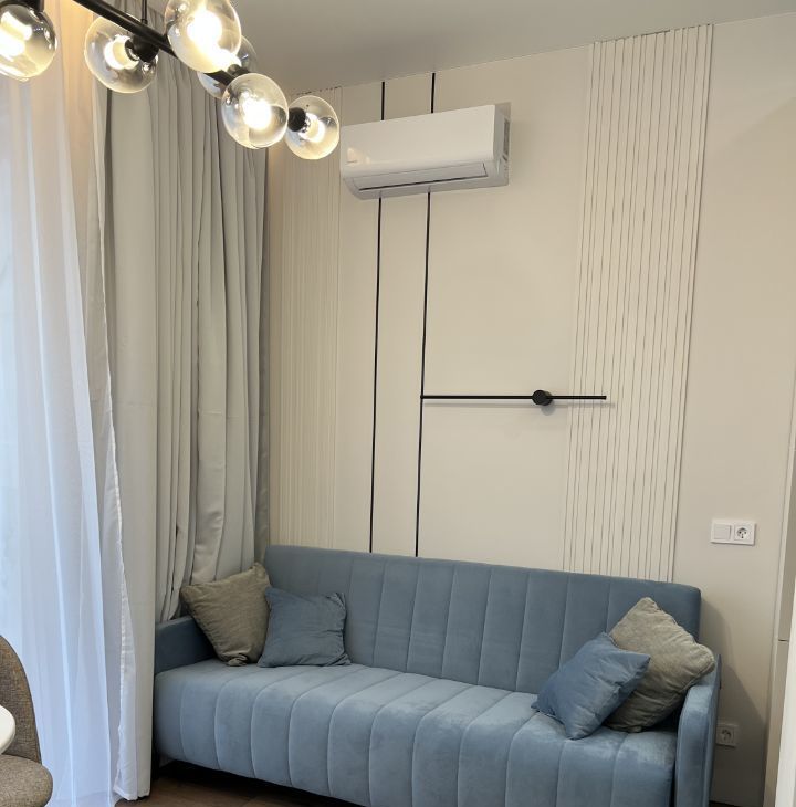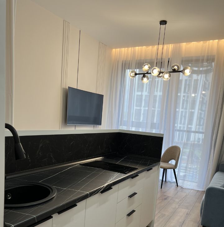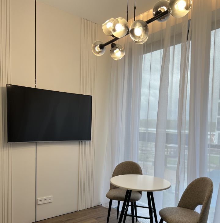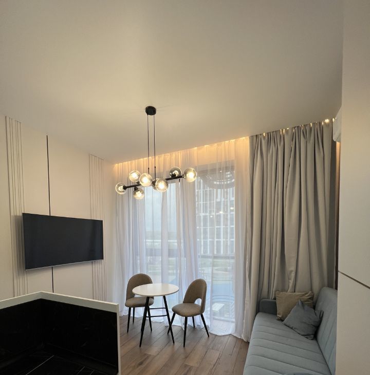 Просторная видовая студия с панорамным остеклением. В квартире выполнен дизайнерский ремонт. Два спальных места - раскладной диван и кровать размером 140х200 метра с матрасом аскона. В санузле установлена ванна. Большое количество шкафов для хранения, также кровать с подъемным механизмом.