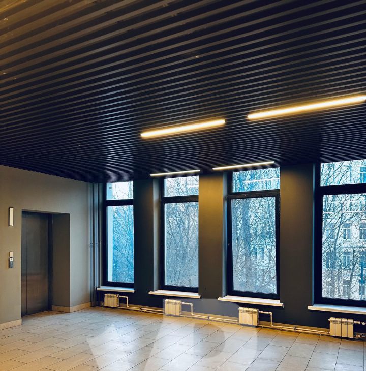 Студия выполнена в современном стиле с большими панорамными окнами