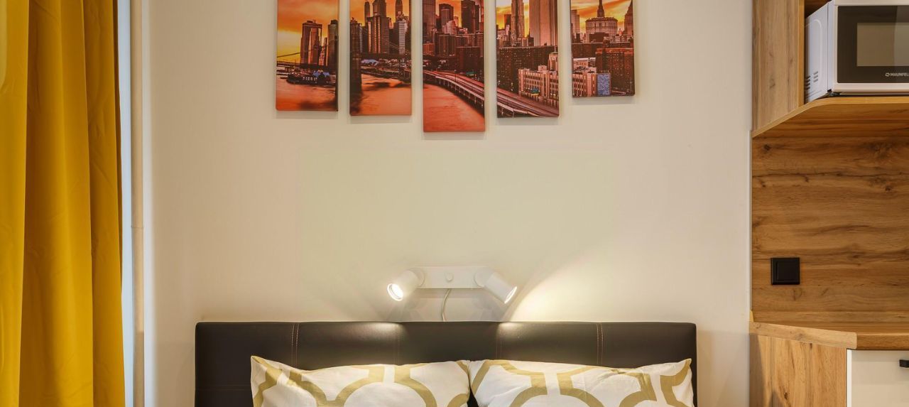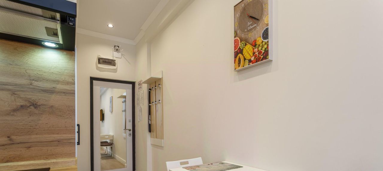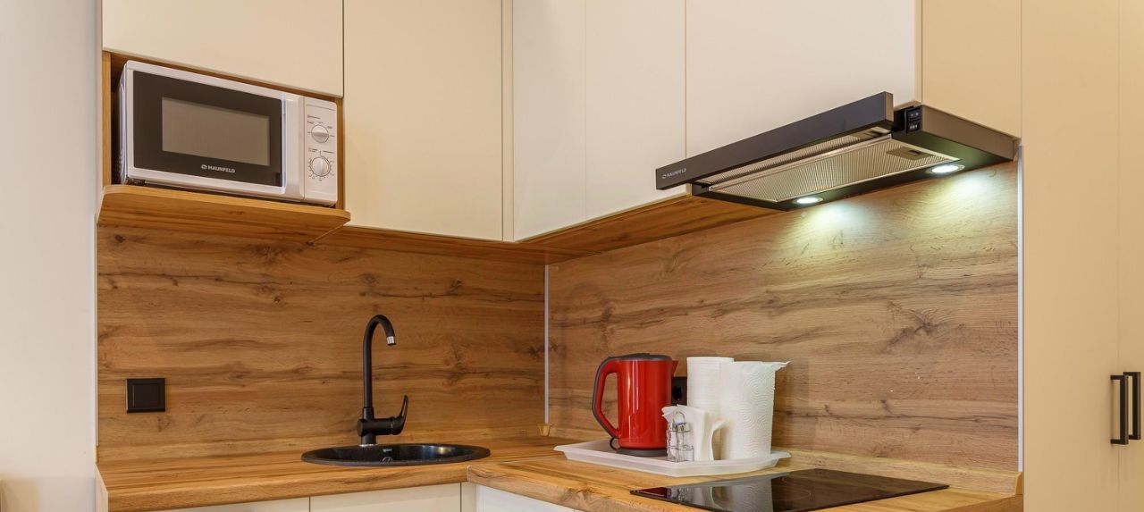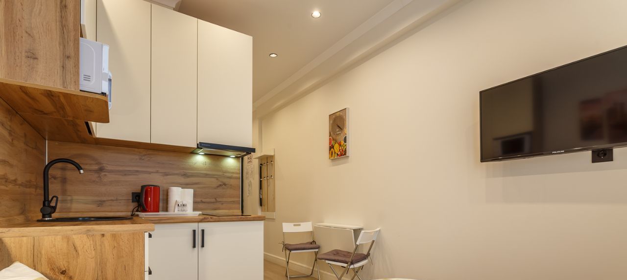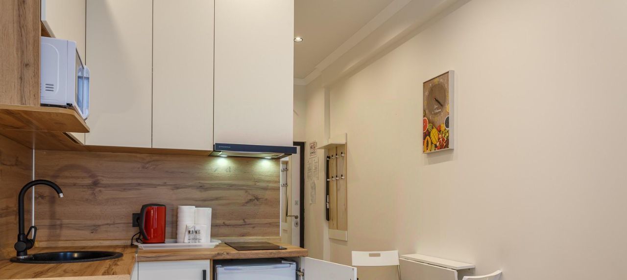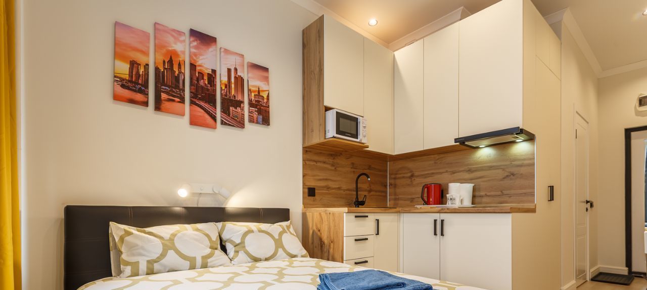 В апартаментах есть всё необходимое для проживания: двуспальная кровать, кондиционер, холодильник, оборудованная кухня (варочная панель, вытяжка).