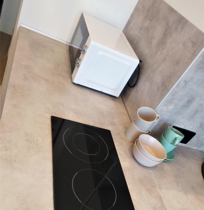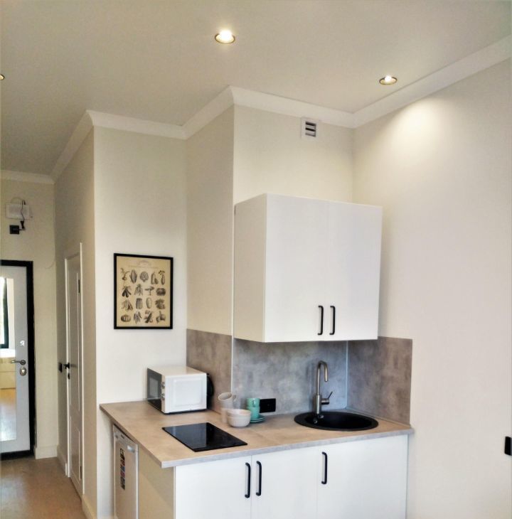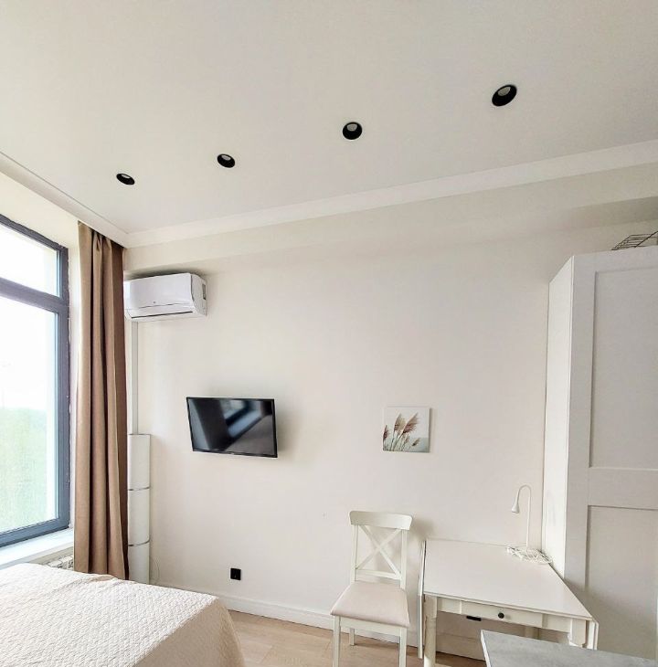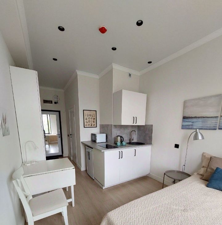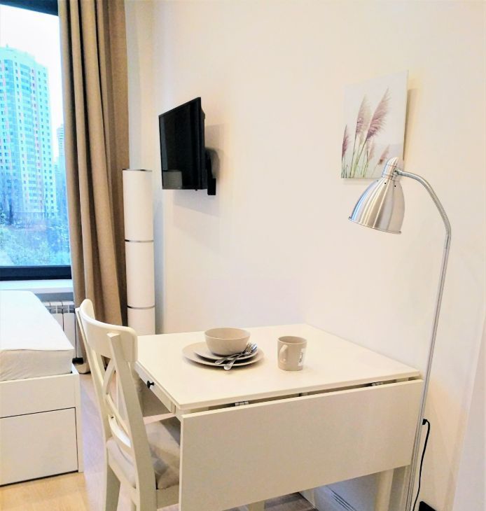 Студия оборудована всей необходимой мебелью и бытовой техникой (холодильник, плита, свч, стиральная машина, утюг, ТВ, чайник), кондиционер.