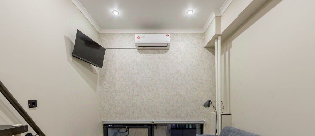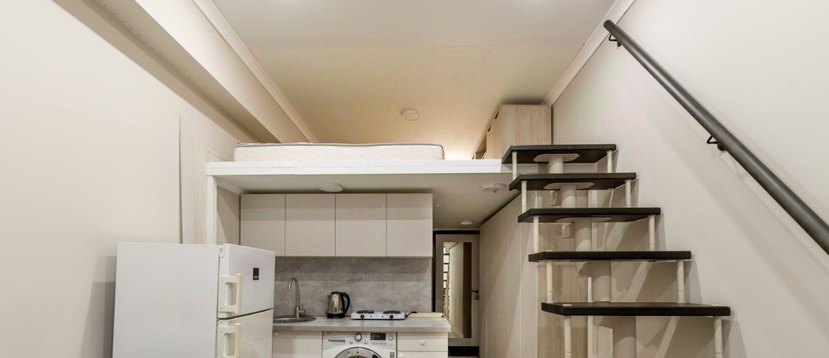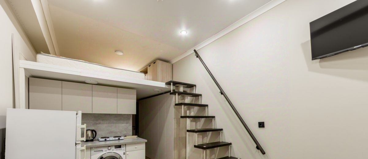 В апартаментах выполнен качественный ремонт. Есть антресоль с двуспальной кроватью и вместительной зоной хранения. На первом уровне: зона кухни, есть электрическая плита, раковина, стиральная машина, кухонный гарнитур. В зоне гостиной удобный раскладной диван, телевизор, есть wi-fi проектор, кондиционер. Санузел совмещенный, душевая кабина зеркало с подсветкой, раковина. В прихожей удобный шкаф, в котором много пространства для хранения личных вещей. Окна выходят во двор.