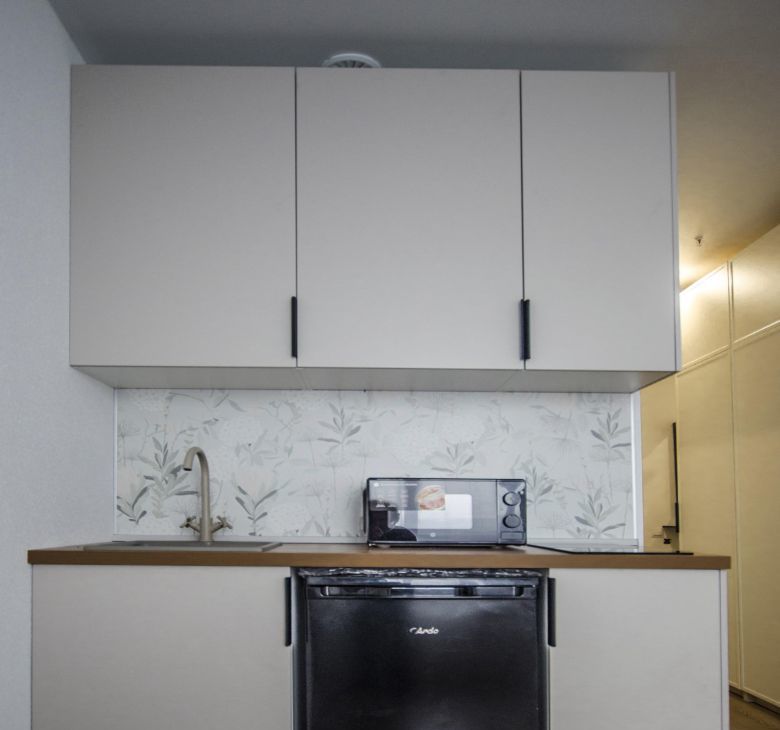 Кухонное пространство - функциональное рабочее место, оснащенное современной бытовой техникой, включая индукционную варочную панель и холодильник, под единой столешницей, СВЧ и чайник.