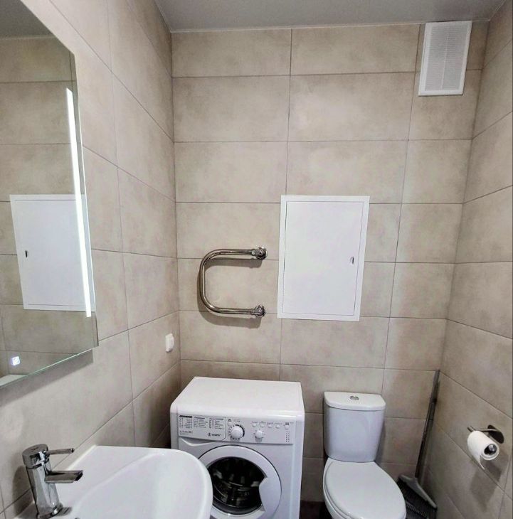 В помещении выполнен современный ремонт. Установлены необходимая мебель, варочная панель, микроволновая печь, холодильник, кондиционер. Санузел совмещённый, оборудован ванной и стиральной машиной.