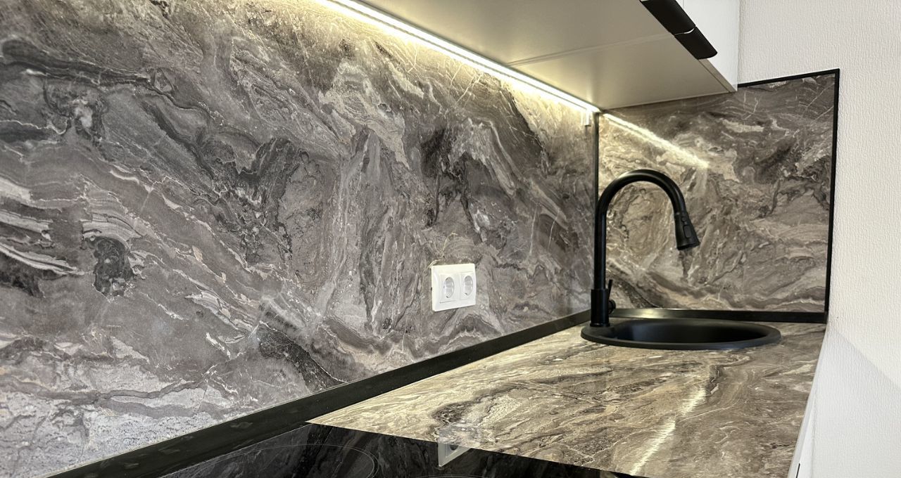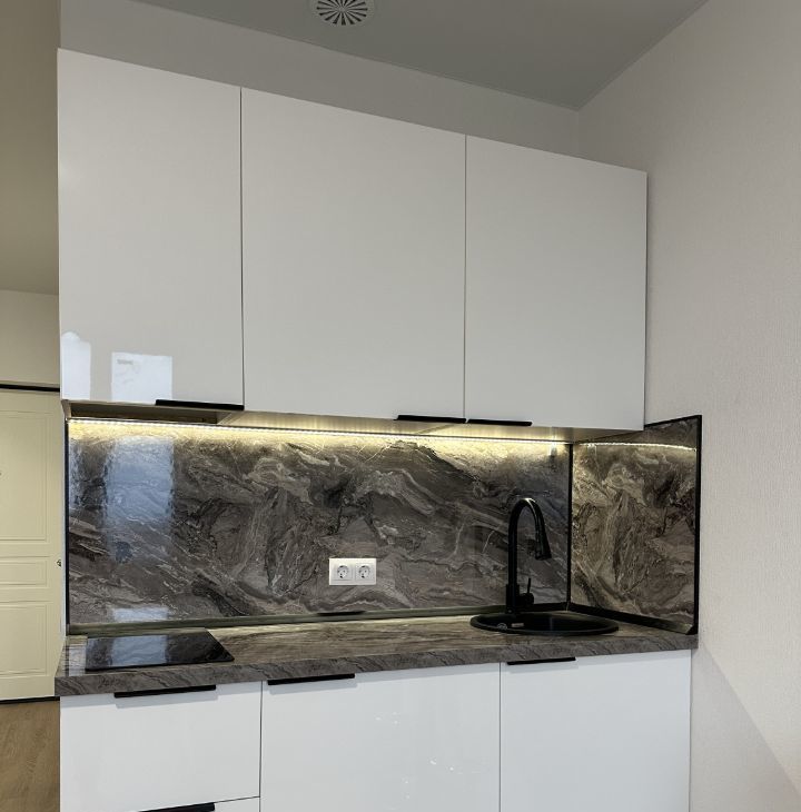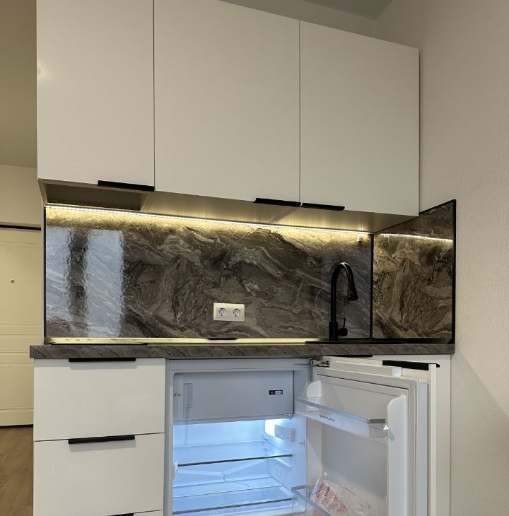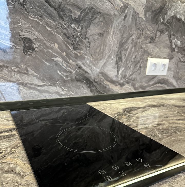 Встроенный кухонный гарнитур под единой столешницей, варочная панель, встроенный холодильник, вытяжка, барная стеклянная стойка, два барных стула.