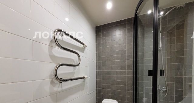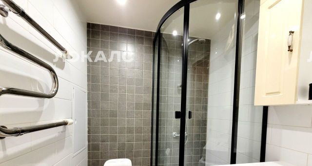 Санузел совмещенный, оснащен полотенцесушителем, душевой кабиной, стиральной машиной.