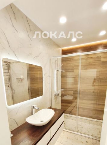 Санузел с вместительной душевой, тумбой раковиной с хранением и зеркалом , оборудованный новой сантехникой, подвесным унитазом. Есть большой полотенцесушитель и теплый пол и водонагреватель!