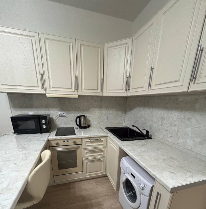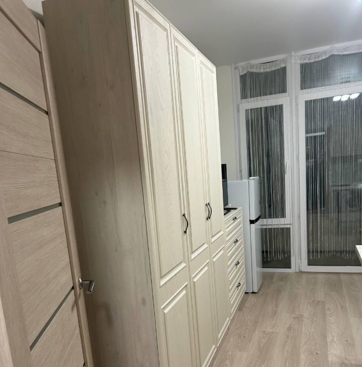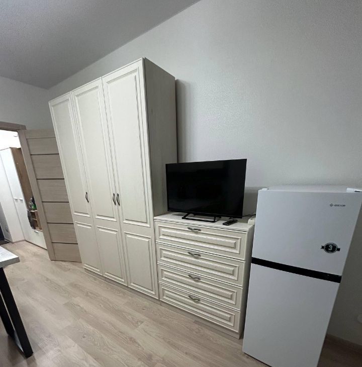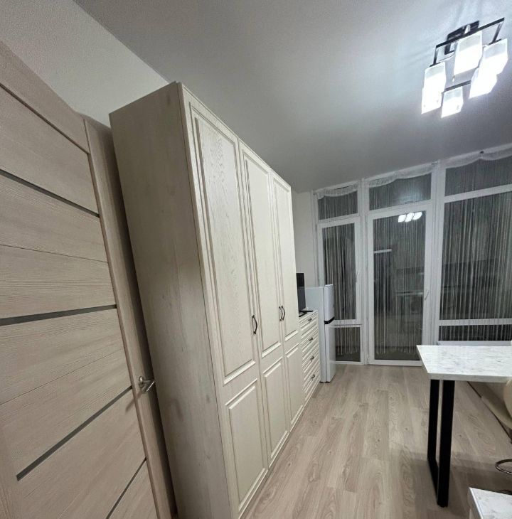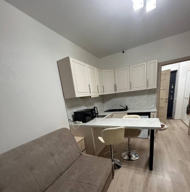 Светлая студия с современным ремонтом и функциональной мебелью.