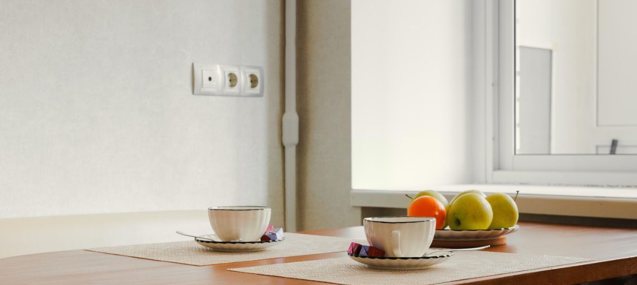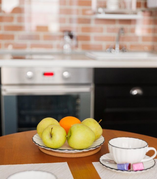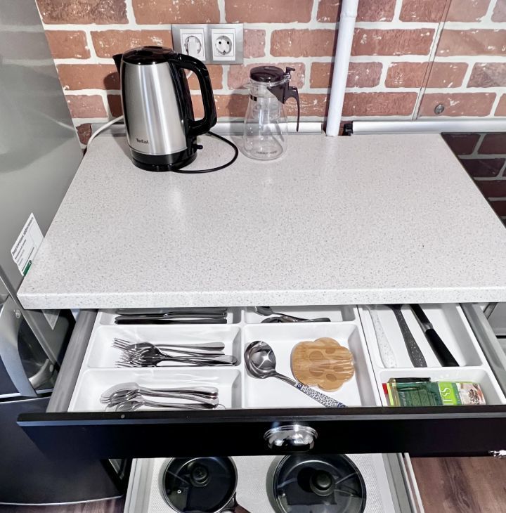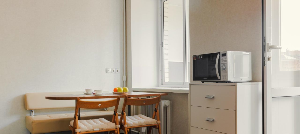 - встроенная кухня с эл.плитой, холодильник, микроволновая печь, эл.чайник, набор новой посуды;