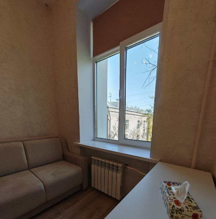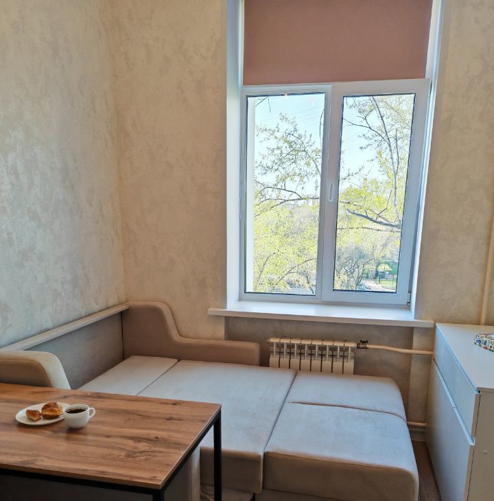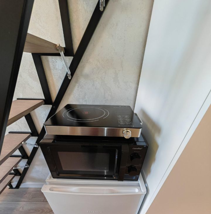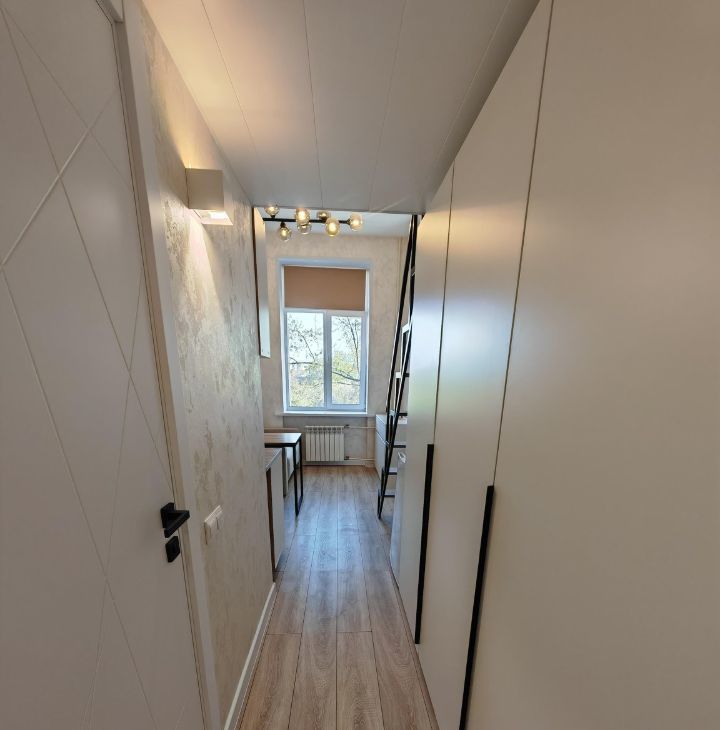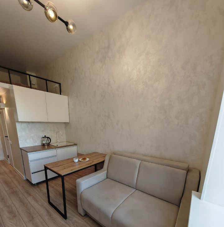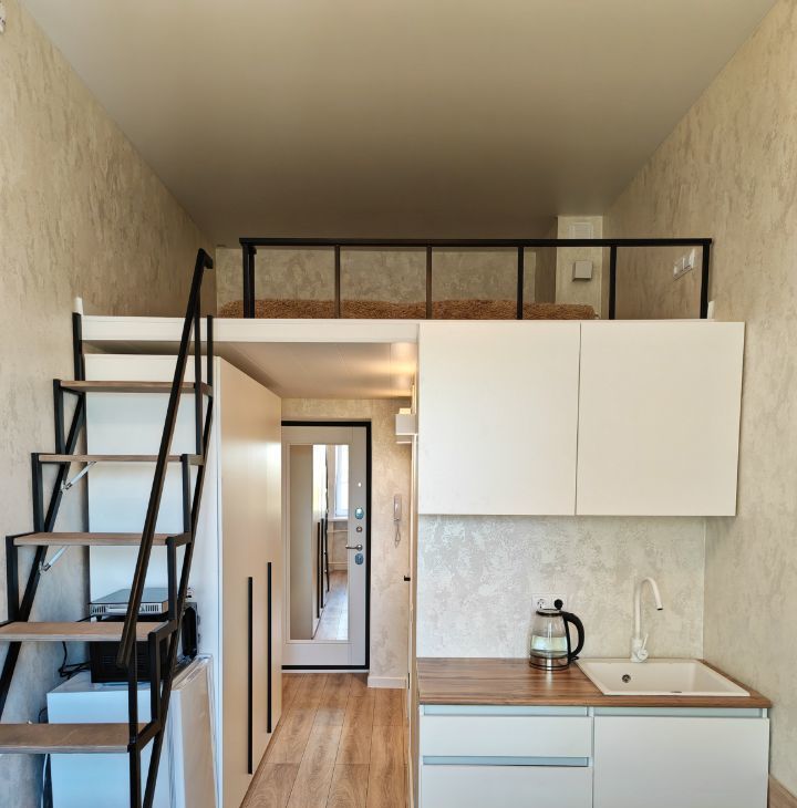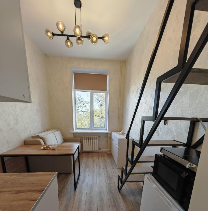Квартира находится на 5 этаже пятиэтажного дома. Общая площадь составляет 15 кв. м, дополнительно к этому есть второй уровень, где расположена спальная зона. Она достаточно просторная 9 кв. м. Высокие потолки, высотой почти 4 метра создают ощущение простора.