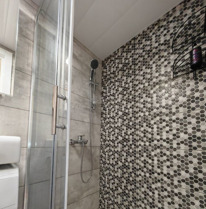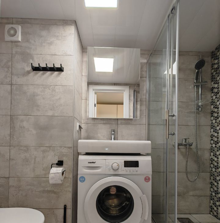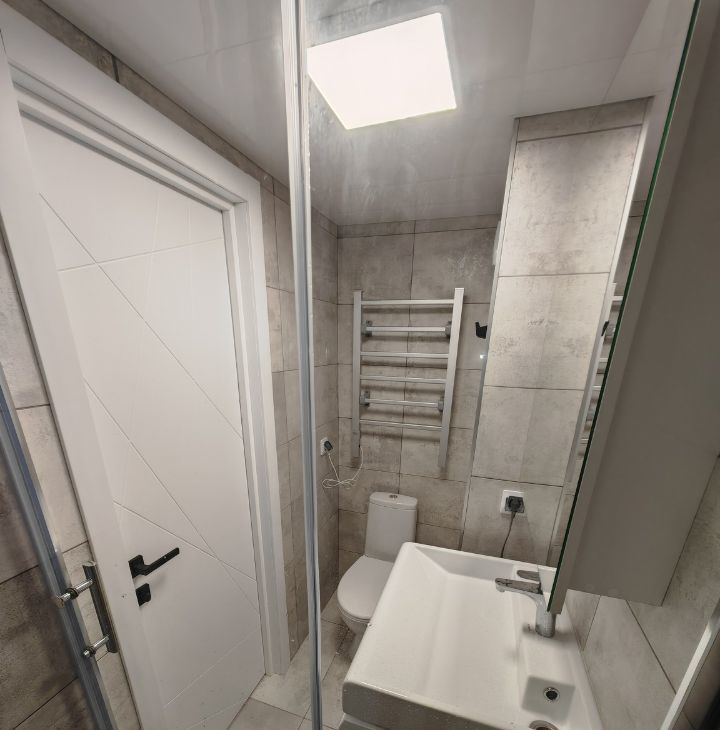 Телевизор или другая необходимая техника могут быть приобретены собственником по запросу арендатора. Совмещенный санузел оборудован просторной душевой, умывальником и зеркальным шкафом.