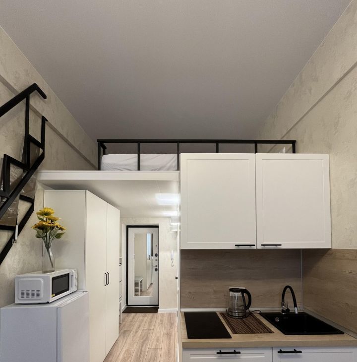 Все новое! Вы будете первыми жильцами. В квартире есть все необходимое для комфортного проживания. Мебель на кухне и в комнате, а также современная техника: холодильник, плита, стиральная машина, микроволновая печь, чайник и утюг. Санузел совмещенный, оборудован душевой кабиной. На антресольном этаже отличное спальное место. Там предусмотрен двухспальный матрас 160х200. Можно воспользоваться самому или предложить поздно засидевшемуся гостю.