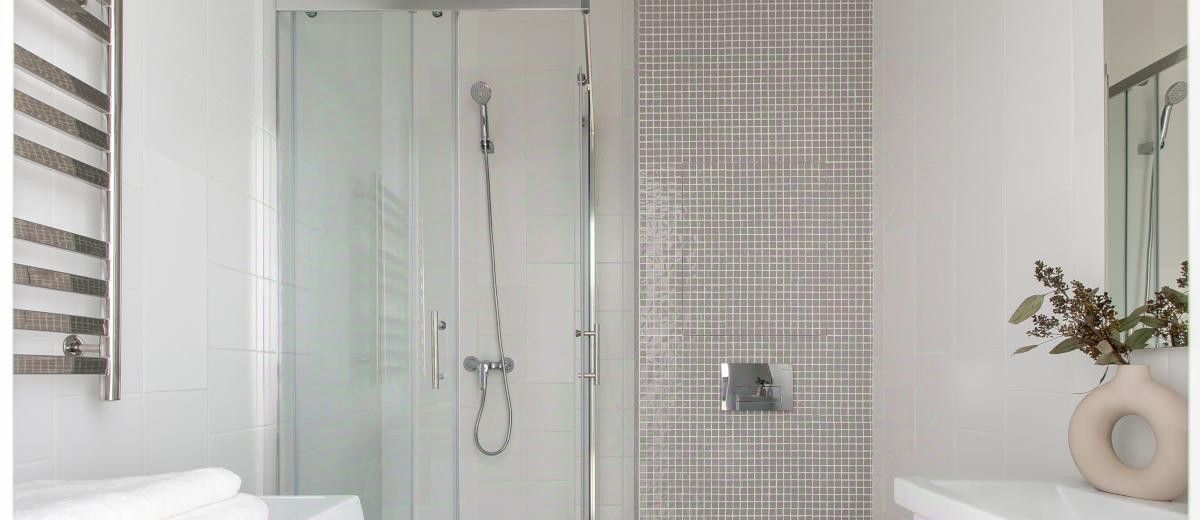 В квартире один совмещенный санузел с душевой кабиной, раковиной и зеркалом с подсветкой и стиральной машиной.