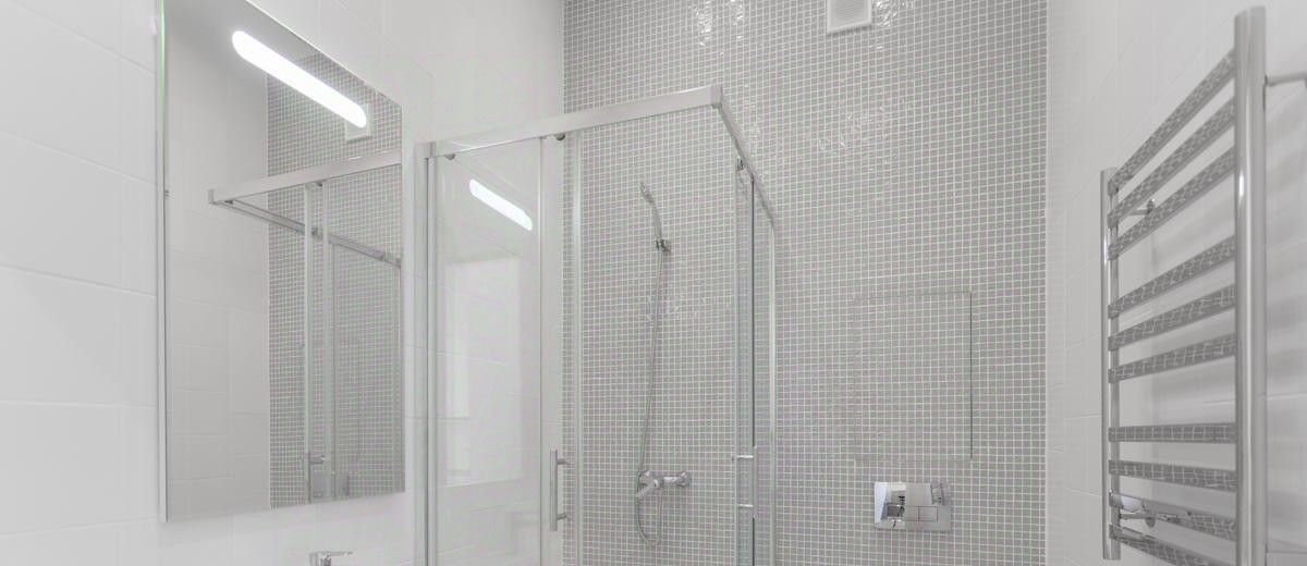 В квартире один совмещенный санузел с душевой кабиной, раковиной и зеркалом с подсветкой и стиральной машиной.