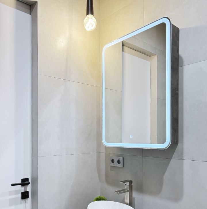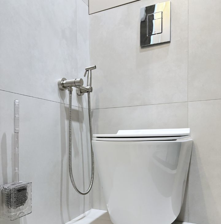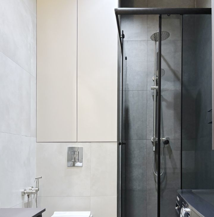 - Светлая ванная комната с современной техникой.