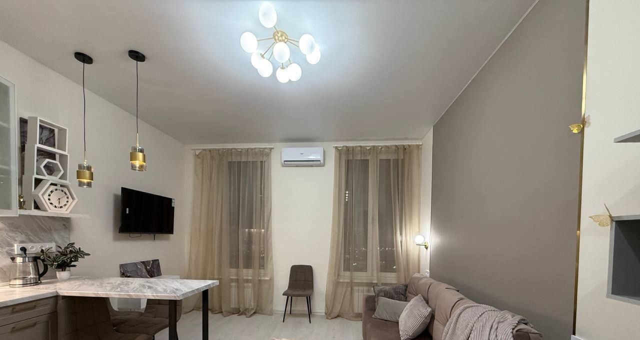 Студия площадью 30 м² представляет собой умное планировочное решение. Пространство объединяет уютную зону отдыха (15 м²), функциональную кухню-столовую (7 м²) с полным набором встроенной техники, включая посудомоечную машину, и современную совмещенную сантехнику. Высокие трехметровые потолки и остекление с видом на улицу наполняют интерьер светом и воздухом. Квартира оснащена мебелью и техникой (кондиционер, стиральная машина, телевизор, холодильник).