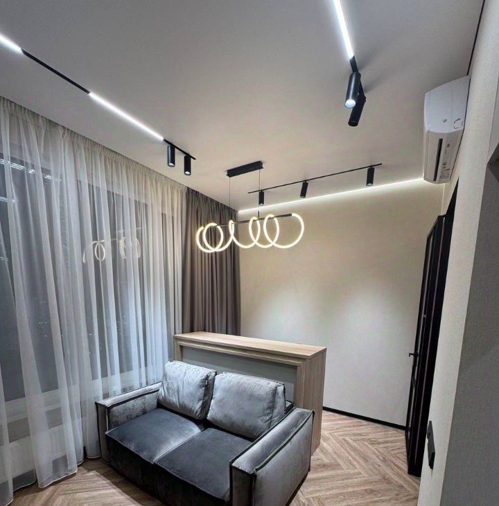 Раскладной диван в гостиной, просторная барная стойка со стильной подсветкой на две персоны.