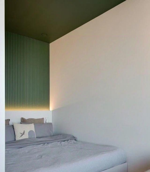 Зона отдыха: стильный диван и выделенная спальная зона с двуспальной кроватью и ортопедическим матрасом.